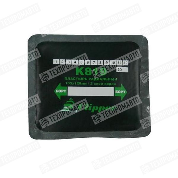 Набор пластырей кордовых Clipper K819 для боковых порезов, 105*120мм (2 слоя корда), серый адгезивный слой редназначен для холодного ремонта повреждений протектора, боковин или плеча радиальных шин любых типов и размеров.