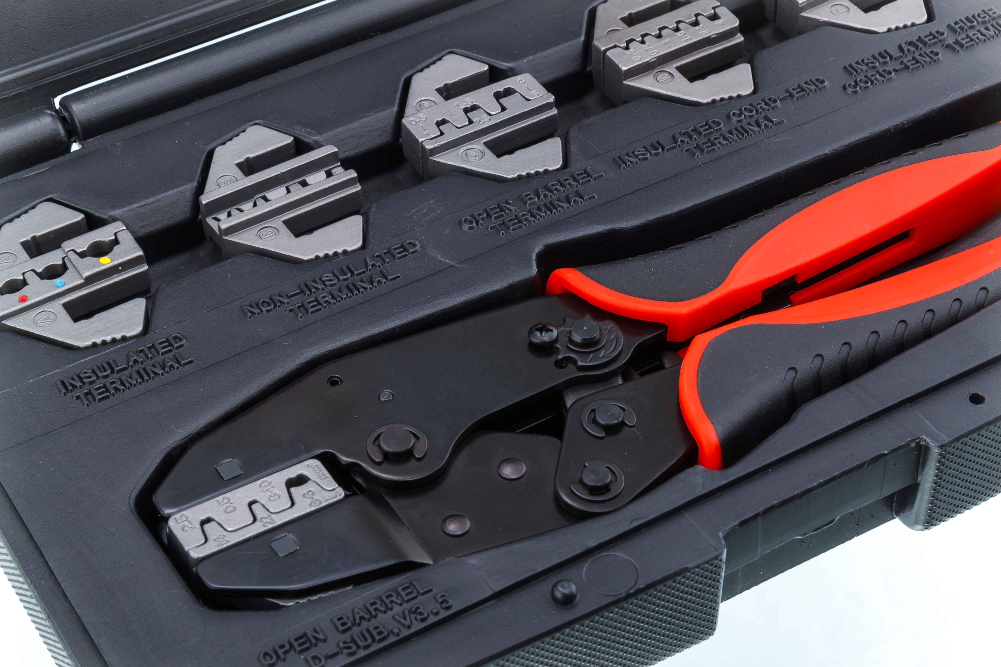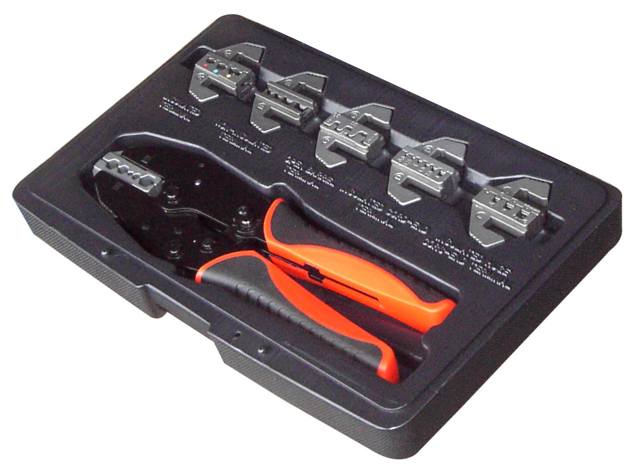 Кримпер храповичный с быстросменными губками: 1 шт. A. Губки для изолированных клемм: 1 шт. Размер сечения провода по стандартам AWG 22.18/16-14/12-10 или DIN 0.5-1.0/1.5-2.5/4-6 мм2 B. Губки для не изолированных клемм: 1 шт. Размер сечения провода по стандартам AWG 20-18/16-14/12-10/8 ; DIN 1.5/2.5/6/10 мм2; JIS 1.25/2/5.5/8 мм2 C. Губки для клемм с открытым корпусом: 1 шт. Размер сечения провода по стандартам AWG 20-18/16-14/12-10 и DIN 0.5-1.0/1.5-2.5/4-6 мм2 D. Губки для клемм cord-end малого размера : 1 шт. Размер сечения провода по стандартам AWG 22/20/18/16/14/12 и DIN 0.5/0.75/1.0/1.5/2.5/4.0 мм2 F. Губки для клемм cord-end большого размера: 1шт. Размер сечения провода по стандартам AWG 10/8/6 и DIN 6.0/10.0/16.0 мм2 H. Губки для клемм RG (коаксильного кабеля): 1шт. Размер сечения провода по стандартам AWG 14-22/8-6 и JIS 2.5/0.5/8-10 мм2