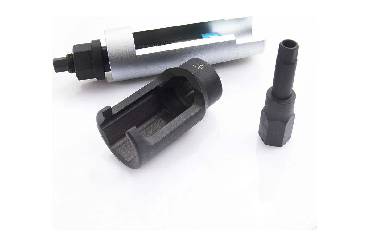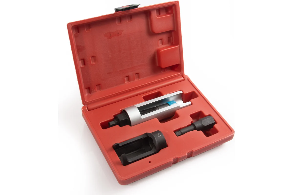 Предназначен для домонтажа форсунок на дизельных двигателях Mercedes-Benz. Применение: Mercedes-Benz C-Class, E-Class, Sprinter (CDI OM 611 / 612 / 613); Jeep Grand Cherokee 2.7 CRD. Подходит для: 108 CDi, 110 CDi 16v, 112 CDi 16v, C220 CDi 16v, E200 CDi 16v. Технические характеристики: - Материал: инструментальная сталь, анодированное покрытие - Вес, кг: 1,4 Комплектация: - головка разрезная 29 мм / 1/2"" / длина 78 мм; - головка с шестигранной вставкой 10мм для извлечения внутренней части форсунки; - съемник форсунок; - кейс.
