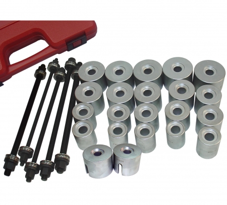 Комплект приспособлений которые позволяют производить работы по замене подшипников и сайлентблоков. Применение оправок из набора сащественно упрощает процесс перепрессовки. Состав комплекта: Оправки 44 x 34mmI. 60 x 50mmQ. 76 x 66mmB. 46 x 36mmJ. 62 x 52mmR. 78 x 68mmC. 48 x 38mmK. 64 x 54mmS. 80 x 70mmD. 50 x 40mmL. 66 x 56mmT. 82 x 72mmE. 52 x 42mmM. 68 x 58mmU. 85 x 75mmF. 54 x 44mmN. 70 x 60mmV. 90 x 80mmG. 56 x 46mmO. 72 x 62mm H. 58 x 48mmP. 74 x 64mm Резьбовой вал 1. M16 x 350mm 2. M14 x 350mm 3. M12 x 350mm 4. M10 x 350mm 5. M18 x 350mm Подходит для большинства автомобилей. Если элемент не поддается выпрессовке, следует: прекратить работу, разобрать инструмент, обработать поверхность выпрессовочного элемента проникающей смазкой, типа WD-40. После этого следует повторить процедуру демонтажа. Во время работы используйте большое количество смазки для предотвращения деформации направляющей шпильки. Во время работы запрещено использовать ударный инструмент. Набор относится к разряду профессионального инструмента. Его использование допускается только квалифицированным персоналом, соблюдая технику безопасности!