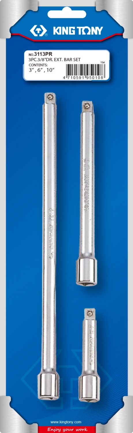 Набор удлинителей KING TONY 3113PR состоит из трех предметов, которые полностью изготовлены из прочной и качественной стали, защищены от коррозии. Удлинители используются вместе с ключом и торцевыми головками для выполнения крепежных работ в труднодоступных местах.