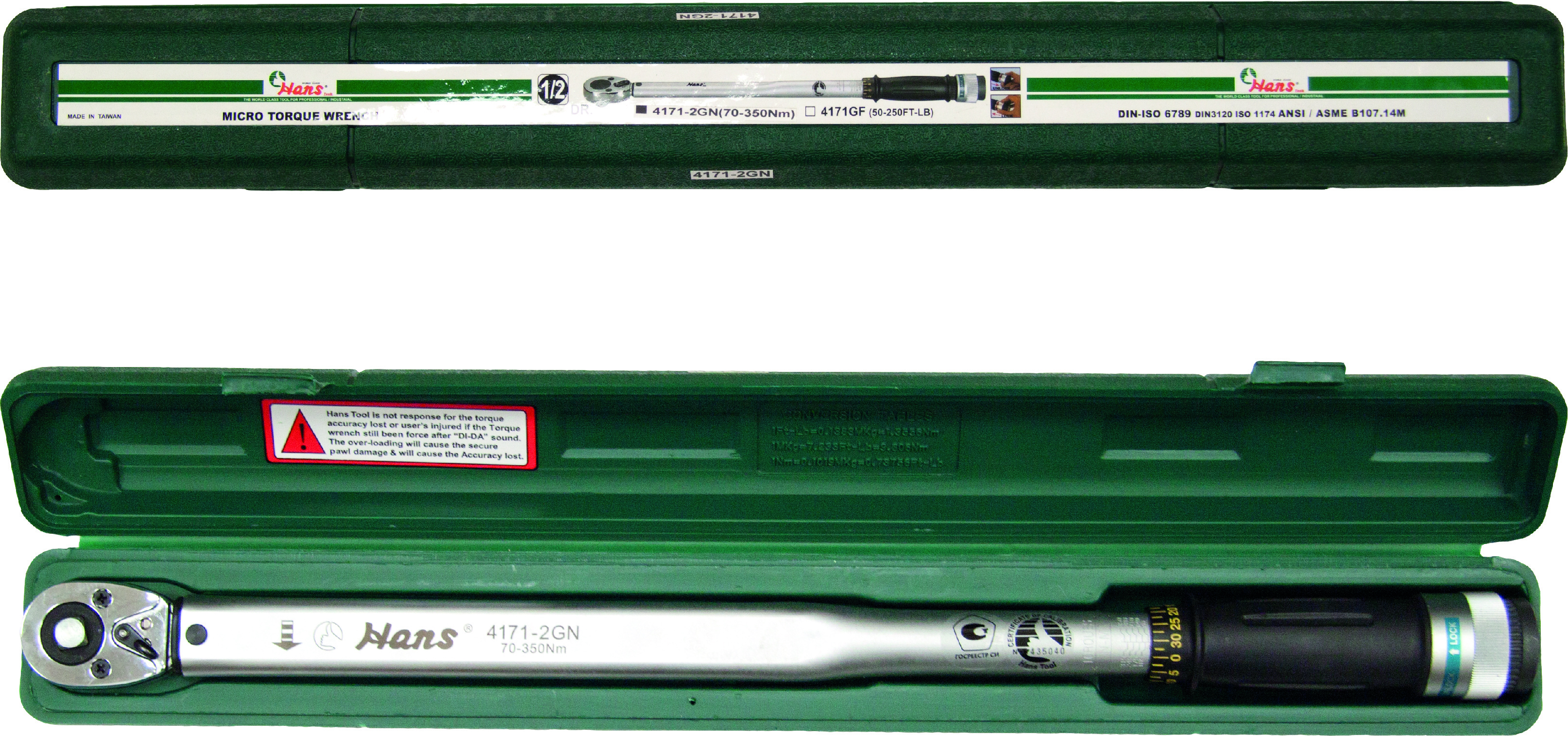 Ключ динамометрический HANS 4171-2GN Технические характеристики: Посадочный квадрат: 1/2' Диапазон затяжки: 70-350Нм Цена деления, Нм: 1 Длина: 630 мм Вес: 2400 гр Погрешность: ±4% Количество циклов между поверками: 5000 Наличие сертификата СИ: да Упаковка: ударопрочный кейс Динамометрический ключ — это высокоточный инструмент, применяющиеся для протяжки ответственного крепежа с заданным усилием. Данный ключ представляет собой трещотку, в привод которой вмонтирован измерительный механизм, который издает характерный щелчок при достижения заданного усилия. И позволяет применять стандартные торцевые головки формата 3/8. Особенности - рассчитан для работы как с левой так и на правой резьбой - имеет две шкалы установки усилия Нм и Кгс - удобный фиксатор привода выставления усилия - флажковый переключатель трещотки облегчает работу в ограниченном пространстве. Динамрметрические ключи HANS изготовлены в соответствии с требованиями стандартов качества DIN ISO 6789 & ASMEB107.14M-2004