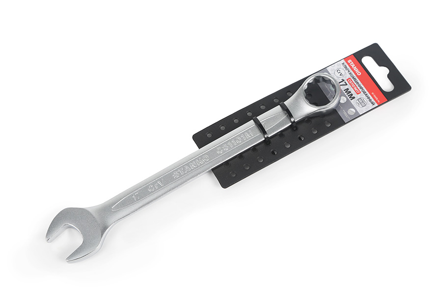 body{margin:0;padding:8px;} p{line-height:1.15;margin:0;white-space:pre-wrap;} ol,ul{margin-top:0;margin-bottom:0;} img{border:none;} li>p{display:inline;} Описание Комбинированный гаечный ключ представляет собой конструкцию, объединяющую рожковый и накидной профили. Назначение Данный вид инструмента применяется для выполнения любых видов работ с крепежом - как дома, в гараже, в авто-слесарной мастерской, станции технического обслуживания авто, мото и другой техники, так и на производстве. Особенности Финишная обработка Soft matt и хром никелевое покрытие комбинированного ключа обеспечивает надежную защиту от коррозии, а также надежный хват и препятствует выскальзыванию инструмента из рук. 12-гранный профиль накидной части подходит к головкам болтов и гайкам как 6-, так и 12-гранного профиля, и обеспечивает 5 градусный шаг перехвата. Специальный отгиб, в 15 градусов накидной части ключа позволит работать в местах с ограниченным доступом к крепежу и поможет подобраться к крепежу как с торца, так и с боку, в зависимости от места выполняемых работ. Качество Ключи изготовлены из высококачественной инструментальной легированной хром-ванадиевой стали. Технология горячей ковки и термической обработки ключей придаёт им особую прочность и высокую надёжность - все те качества, которые соответствуют требованиям стандартов DIN 3113, ISO 7738. Гарантия На ключи бренда STANKO распространяется пожизненная гарантия.
