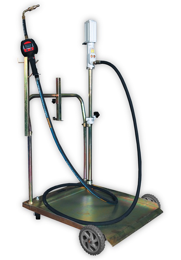 Комплект для маслораздачи в составе пневматического насоса 5:1, маслораздаточного пистолета, электронного расходомера, тележки и шланга.