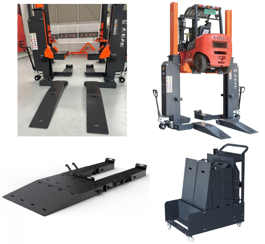 Комплект кронштейнов подхвата с заездными трапами и пандусами для подъема вилочных погрузчиков. Опция для подкатных колонн EE-HDM8х. Рассчитана на работу с погрузчиками с низким клиренсом. Безопасный подхват погрузчиков за раму. Конструкция отличается отсутствием креплений и компактным решением для хранения. В комплект поставки входят центральный пандус в начале заезда и центральный заездной трап в начале заезда, а также тележка для транспортировки всего набора. Длина (с учетом заездных пандусов) 3496 мм Ширина заездного трапа 340 мм Высота 170 мм Угол заездных пандусов 10 град. Максимально допустимая нагрузка 8т.