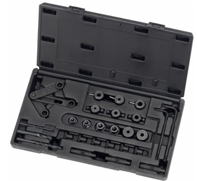 Данный набор включает в себя все необходимые приспособления для извлечения сломанных и поврежденных шпилек на головках блока цилиндров и выпускных коллекторах. Применение этого инструмента позволяет провести эти операции без снятия ГБЦ. Рассчитан на работу со шпильками м8 и м10