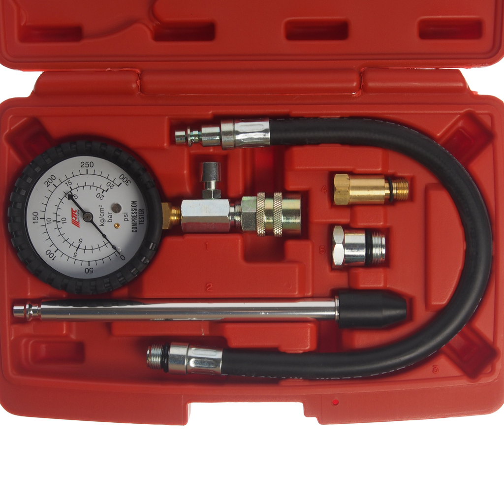 При подключении прибора к цилиндру (через свечное отверстие или отверстие для форсунки) давление подается через открытый запорный клапан на манометр, а в моменты падения давления (при движении поршня к НМТ) клапан закрывается, сохраняя давление в трубке компрессометра. Это дает возможность оценивать давление, которое возникает в камере сгорания на очень короткий промежуток времени. После проведения измерения давление в трубке сбрасывается нажатием на кнопку, и стрелка манометра устанавливается на нулевое деление шкалы.