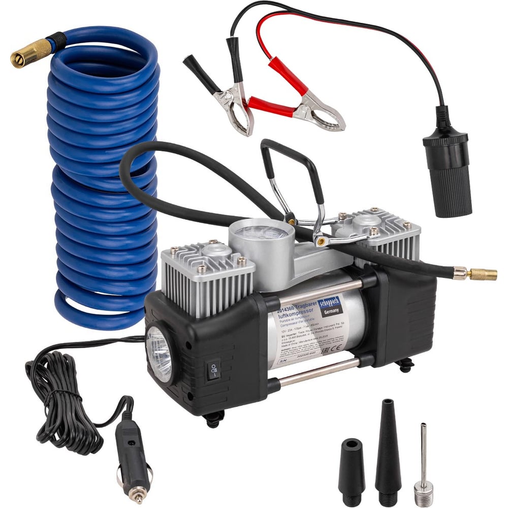 Автомобильный компрессор от бренда Scheppach — это мощное и практичное устройство для быстрой подкачки шин и других надувных изделий. Благодаря высокой производительности и прочной конструкции он станет надёжным спутником в дороге и дома.Производительность 65 л/мин — обеспечивает быстрый результат даже при работе с крупными колёсами.Давление до 7 бар — подходит для легковых автомобилей, внедорожников и лёгкой спецтехники.Двухцилиндровая система (30 мм) — гарантирует стабильную подачу воздуха и высокую эффективность.Прочный корпус из металла и полипропилена — сочетает долговечность и лёгкость.Рабочий диапазон −30…+50 °C — надёжно работает в жару и мороз.20 минут непрерывной работы — позволяет обслужить несколько шин подряд без перегрева.Удобные шланги — резиновый 0,6 м и витой 0,2–3 м обеспечивают комфорт при подключении.Надёжное подключение через крокодилы — безопасное соединение с аккумулятором.Три насадки в комплекте — расширяют возможности: от автомобильных шин до мячей и надувных лодок.Фонарь в корпусе — помогает работать в темноте, освещая колесо и делая подкачку безопаснее и удобнее.