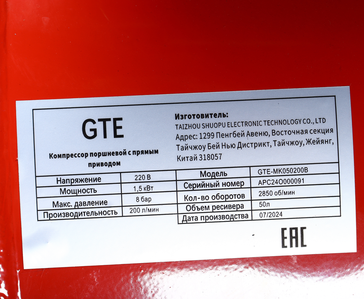 Компрессор поршневой с прямым приводом 220 В, ресивер 50 л, 200 л/мин.