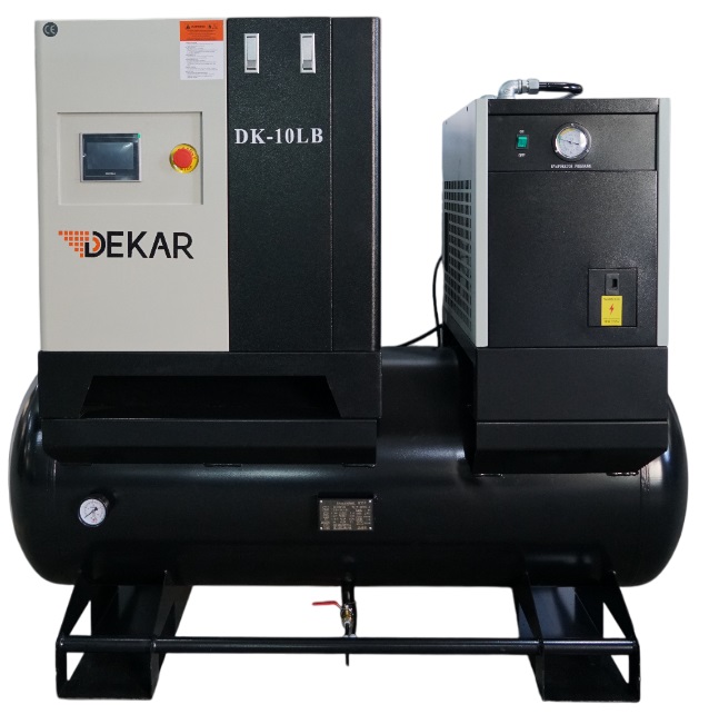 Компрессор винтовой Dekar DK-10LB 10bar с ресивером и осушителем. Основные особенности и преимущества: Применение в приводе высоко эффективного электродвигателя с постоянными магнитами и частотного преобразователя позволяет достигнуть низкого потребления электроэнергии (частотный преобразователь обеспечивает точную подстройку выходной мощности компрессора в зависимости от нагрузки) Тип привода: прямой. Воздушное охлаждение. Три фильтра предварительной очистки гарантируют чистоту воздуха на выходе. Эффективный осушитель воздуха рефрижераторного типа. Низкий уровень шума и вибрации. Надежная автоматика упрощает процесс управления. Удобство в эксплуатации и простота в техническом обслуживании. Компактное исполнение: для размещения требуется минимальная рабочая площадь. Современный дизайн. Практичное цветовое исполнение (цвет черный/серый RAL9005/7035) Количество масла: 4л