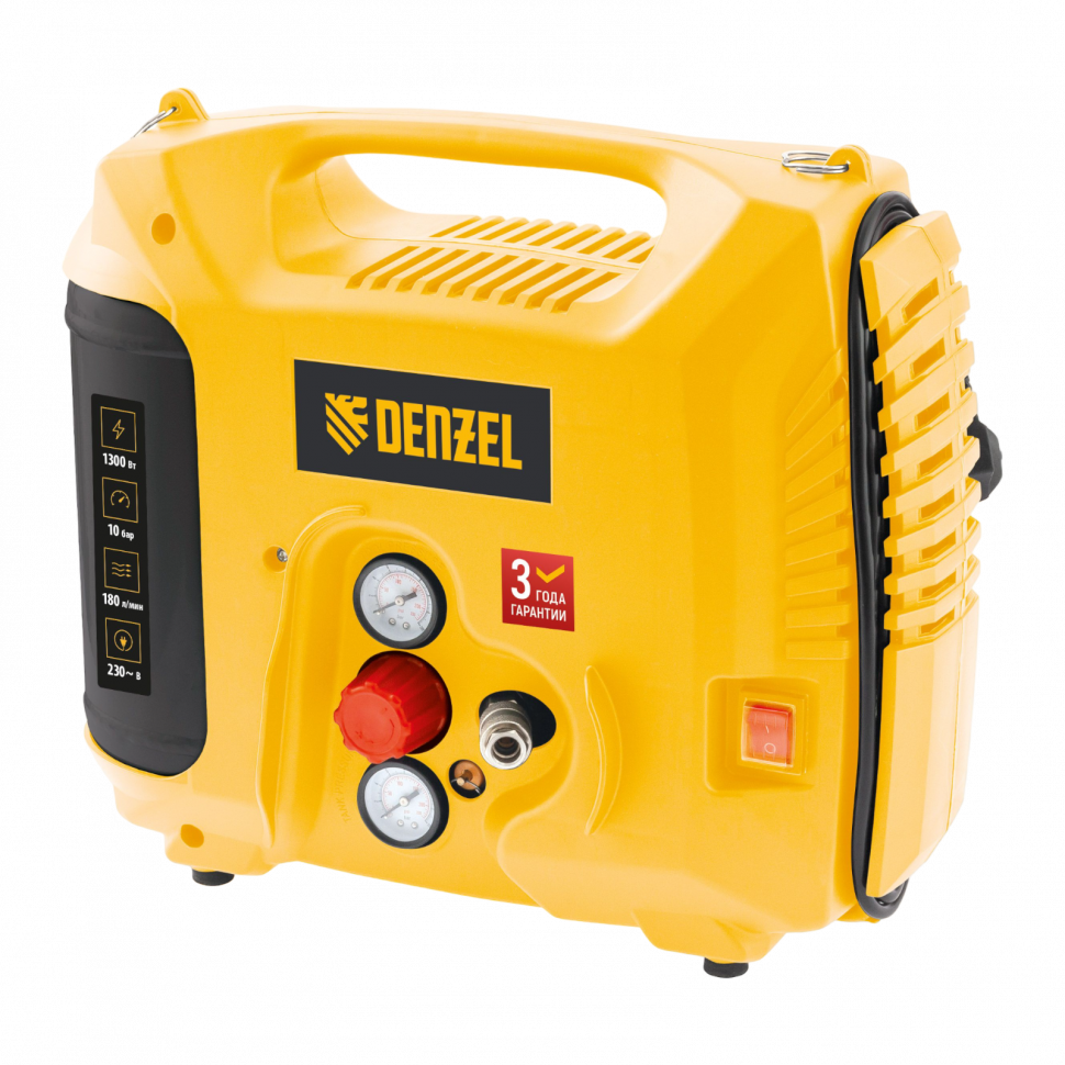 Компрессор воздушный Denzel DL1300 58011 мощностью 1,3 кВт, с максимальным рабочим давлением 10 бар, обеспечивает производительность 180 л/мин и поставляется с набором аксессуаров. Предназначен для обеспечения сжатым атмосферным воздухом нейлеров, степлеров, продувочных пистолетов, окрасочных и мовильных пистолетов и других пневмоинструментов, не требующих большого объема воздуха. Компрессор идеален для накачивания автомобильных шин, лодок, матрасов, мячей и прочих надувных изделий, а также для продувки труб водоснабжения.