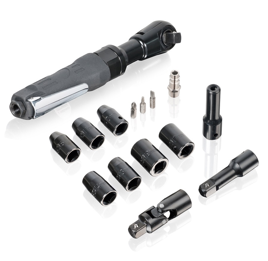 Пневматическая трещотка 1/2", максимальный крутящий момент 60 Нм., скорость вращения 160 об/мин. В комплекте набор головок.