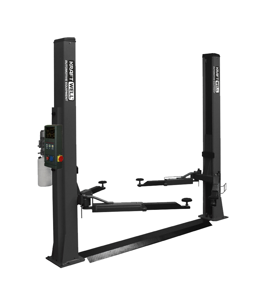 Подъемник двухстоечный электрогидравлический, асимметричный, двухцилиндровый, г/п 4000 кг., 2,2 кВт, высота подъема 1800 мм., расстояние между стойками 2760 мм., с нижней синхронизацией стальным тросом.