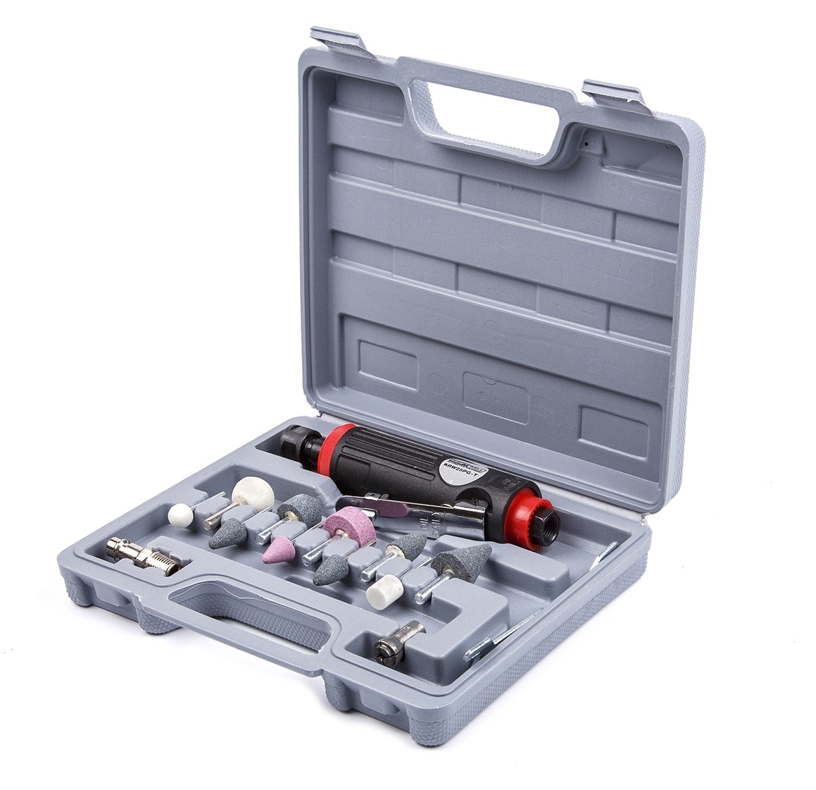 Пневматическая бормашинка 1/4", скорость вращения 25000 об/мин. В комплекте набор насадок - 10 шт.