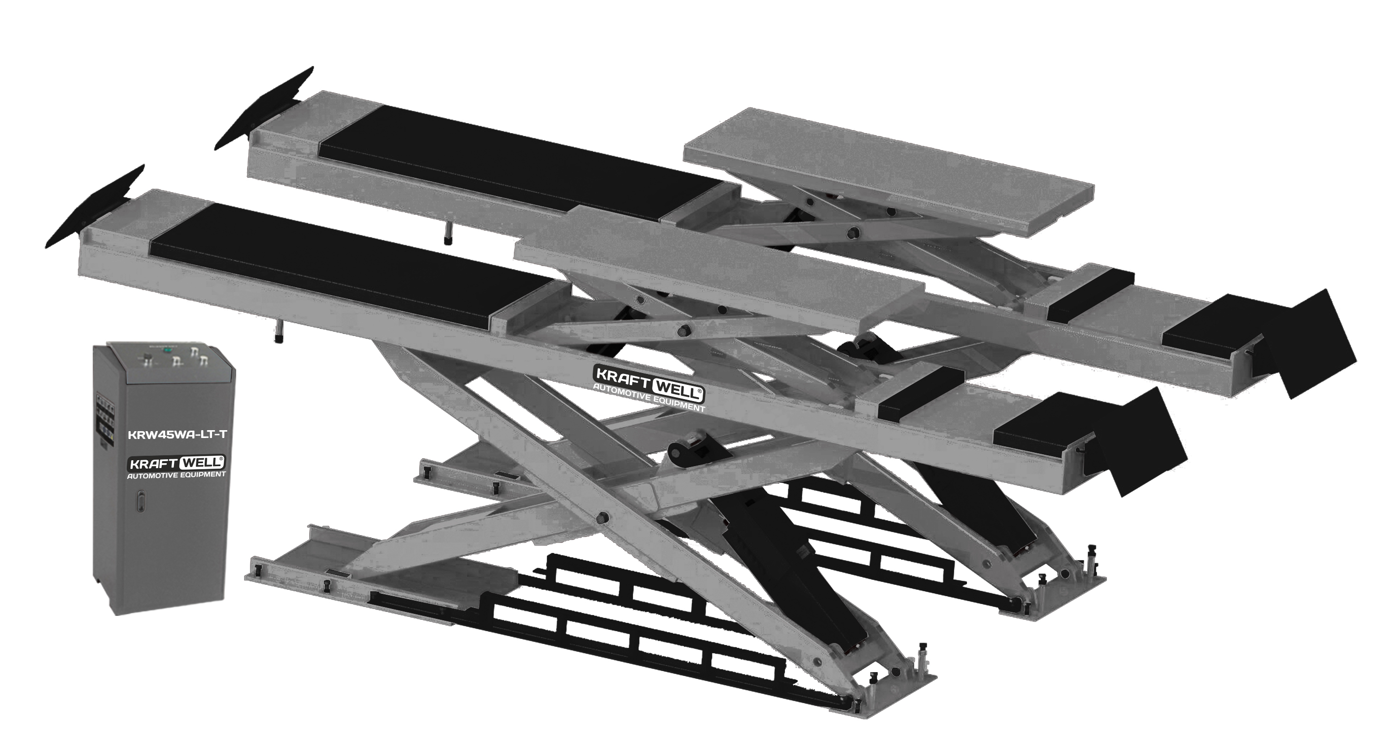 Подъемник ножничный, электрогидравлический, заглубляемый г/п 4500 кг., 2,2 кВт, 8-10 бар, высота подъема 1850+450 мм., размеры платформ 4500х620 мм, клиренс 330 мм., расстояние между платформами 800 мм., платформы - для сход-развала со встроенным ножничным подъемником второго уровня