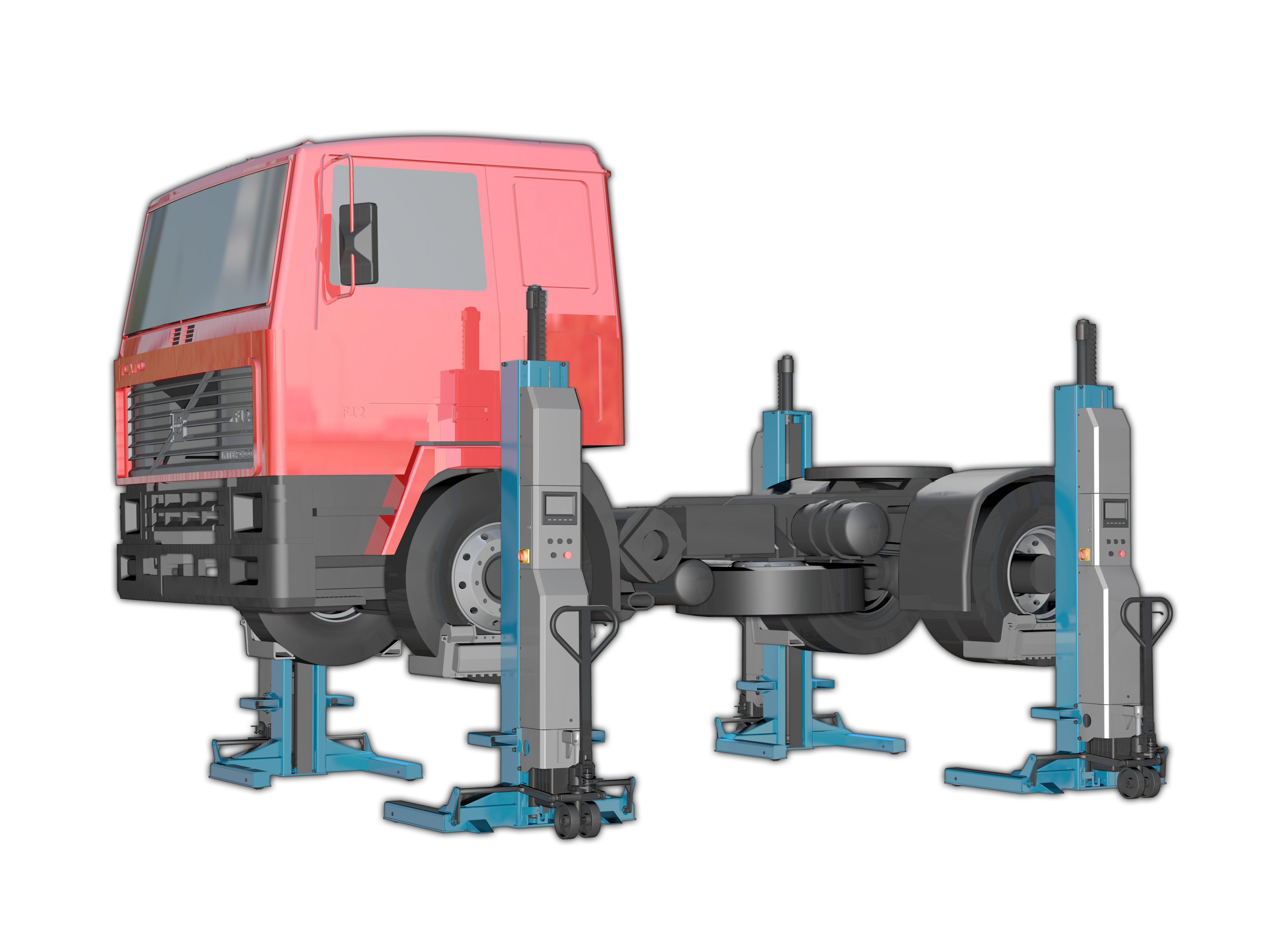 Колонны подкатные, электрогидравлические, грузоподъемность 34 000 кг. Четыре мобильные стойки г/п 8500 кг каждая. Беспроводные.