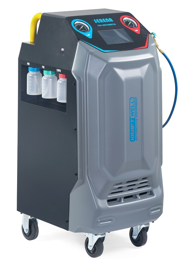 Полностью автоматическая установка для обслуживания систем кондиционирования легковых автомобилей с фреоном R-134a. Сенсорный дисплей 7". Совместима с автомобилями с ДВС, электрмобилями и гибридами. Функции: откачивание и очистка хладагента из системы, отделение и последующий сброс масла, вакуумирование системы, автоматическая заправка фреона и масла.