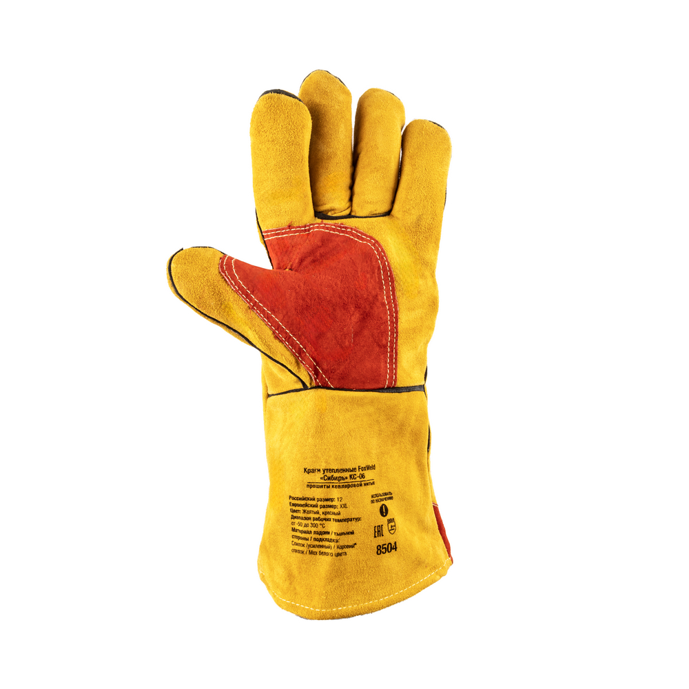 Краги утеплённые Сибирис КС-06 идеально подходят для работ при низких температурах. Краги Сибирис сшиты из рыжего высококачественного спилка, усилены красным спилком на большом пальце и ладонной части. Подкладка из плотного искусственного меха белого цвета позволяет проводить сварочные работы на улице в суровых холодных условиях крайнего Севера.РАБОТА ПРИ НИЗКИХ ТЕМПЕРАТУРАХ: Подкладка из плотного искусственного меха позволяет проводить сварочные работы на улице при низких температурах в суровых условиях крайнего Севера.УСИЛЕННАЯ РАБОЧАЯ ЧАСТЬ: Усиленная спилковая накладка в области ладони и большого пальца добавляет прочности и обеспечивает эффективную защиту от открытого огня, искр и брызг раскалённого металла.КЕВЛАРОВЫЕ НИТИ: Швы прошиты прочной огнестойкой нитью Kevlar, что придаёт дополнительную прочность и защищает руки при сварочных работах.ПРЕИМУЩЕСТВА:Работа в суровых холодных условияхЗащита от тепла и ожоговЗащита от искр и испаренийРыжий высококачественный спилокКрасный спилок на ладони и большом пальцеПлотный искусственный мех белого цвета