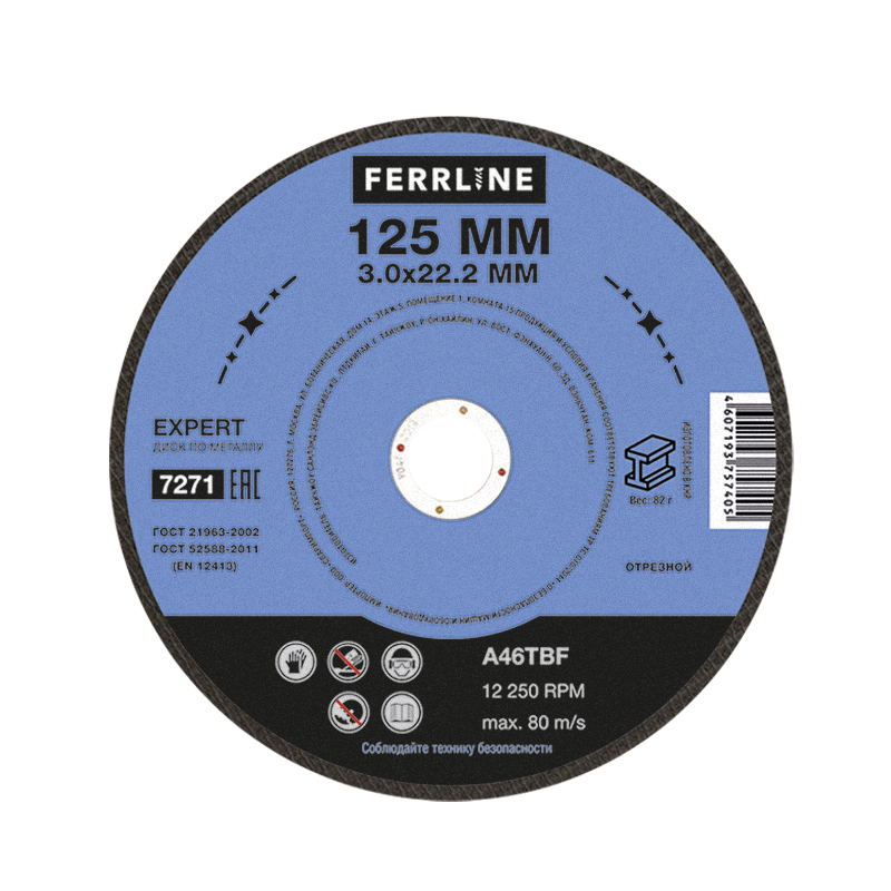 Диск отрезной по металлу FerrLine Expert 125 х 3 х 22,2 мм A46TBF - расходный инструмент для ручной угловой шлифовальной машины, предназначенный для резки различных изделий из чёрных металлов (чугунов). Конструктивно представляет собой плоский диск (тип 41), поверхность которого покрыта слоем абразивных частиц. Посыпка скреплена между собой бакелитовой связкой и армирована одной стекловолоконной сеткой и тканой подложкой. Поставляется во влагозащитной упаковке. Серия EXPERT - абразивный состав, оптимизированный для высокой износостойкости при резе чёрных металлов. Это свойство даёт увеличенный срок службы одного круга, давая возможность сделать значительно бОльшее количество резов заготовки, чем круги с обычным абразивом. Не рекомендуется для реза изделий из нержавеющей стали во избежание перегрева, прижога, окисления, потери эффективности легирующих добавок.ИЗНОСОСТОЙКОСТЬ: Благодаря премиальной формуле режущая и шлифовальная способность абразива снижается в процессе работы значительно медленнее, позволяя выполнить больше работы.УНИКАЛЬНЫЙ СОСТАВ: Технология производства включает в себя эксклюзивный рецепт абразива и смол: применение только твёрдых составов класса ВТ1, ВТ2, армирование сеткой из стекловолокна. Высокая твёрдость связывающей смолы позволяет сделать значительно большее количество резов по сравнению с кругами с обычным абразивом.МЕТАЛЛИЧЕСКОЕ КОЛЬЦО: Металлическое кольцо на диске обеспечивает плотную посадку на фланец УШМ, исключая биения и вибрацию при работе.ГЕРМЕТИЧНОСТЬ УПАКОВКИ: Диски упакованы в специальную термоусадочную герметичную плёнку, которая предохраняет от пыли и влаги при длительном хранении в условиях повышенной влажности, на строительных объектах и крупных промышленных производствах.ПРЕИМУЩЕСТВА:По чёрному металлу (!)Тип 41 (плоский)Высокая износостойкость (долгий срок службы)Состав на базе оксида алюминияПрофессиональный компаундВлагозащитная упаковкаКОМПЛЕКТАЦИЯ: Отрезной круг по чёрному металлу в термоусадочной плёнке со вкладышем – 5 шт.