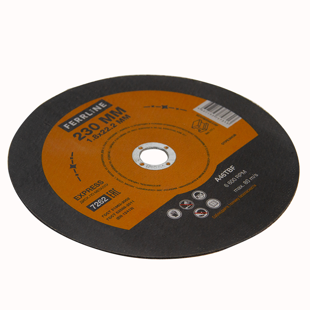 Диск отрезной по металлу FerrLine Express 230 х 1,8 х 22,2 мм A46TBF - расходный инструмент для ручной угловой шлифовальной машины, предназначенный для резки различных изделий из чёрных металлов (чугунов). Конструктивно представляет собой плоский диск (тип 41), поверхность которого покрыта слоем абразивных частиц. Посыпка скреплена между собой бакелитовой связкой и армирована одной стекловолоконной сеткой и тканой подложкой. Поставляется во влагозащитной упаковке. Серия EXPRESS представляет абразивный состав высокой твёрдости, оптимизированный для скоростного реза чёрных металлов. Не рекомендуется для реза изделий из нержавеющей стали во избежание перегрева, прижога, окисления, потери эффективности легирующих добавок.ИЗНОСОСТОЙКОСТЬ: Благодаря премиальной формуле режущая и шлифовальная способность абразива снижается в процессе работы значительно медленнее, позволяя выполнить больше работы.УНИКАЛЬНЫЙ СОСТАВ: Технология производства включает в себя эксклюзивный рецепт абразива и смол: применение только твёрдых составов класса ВТ1, ВТ2, армирование сеткой из стекловолокна. Высокая твёрдость связывающей смолы позволяет сделать значительно большее количество резов по сравнению с кругами с обычным абразивом.МЕТАЛЛИЧЕСКОЕ КОЛЬЦО: Металлическое кольцо на диске обеспечивает плотную посадку на фланец УШМ, исключая биения и вибрацию при работе.ГЕРМЕТИЧНОСТЬ УПАКОВКИ: Диски упакованы в специальную термоусадочную герметичную плёнку, которая предохраняет от пыли и влаги при длительном хранении в условиях повышенной влажности, на строительных объектах и крупных промышленных производствах.ПРЕИМУЩЕСТВА:По чёрному металлу (!)Тип 41 (плоский)Быстрый резСостав на базе оксида алюминияМеталлическое кольцо для плотной посадки на фланец УШМВысокая твёрдость составаВлагозащитная упаковкаКОМПЛЕКТАЦИЯ: Отрезной круг по чёрному металлу в термоусадочной плёнке со вкладышем – 10 шт.
