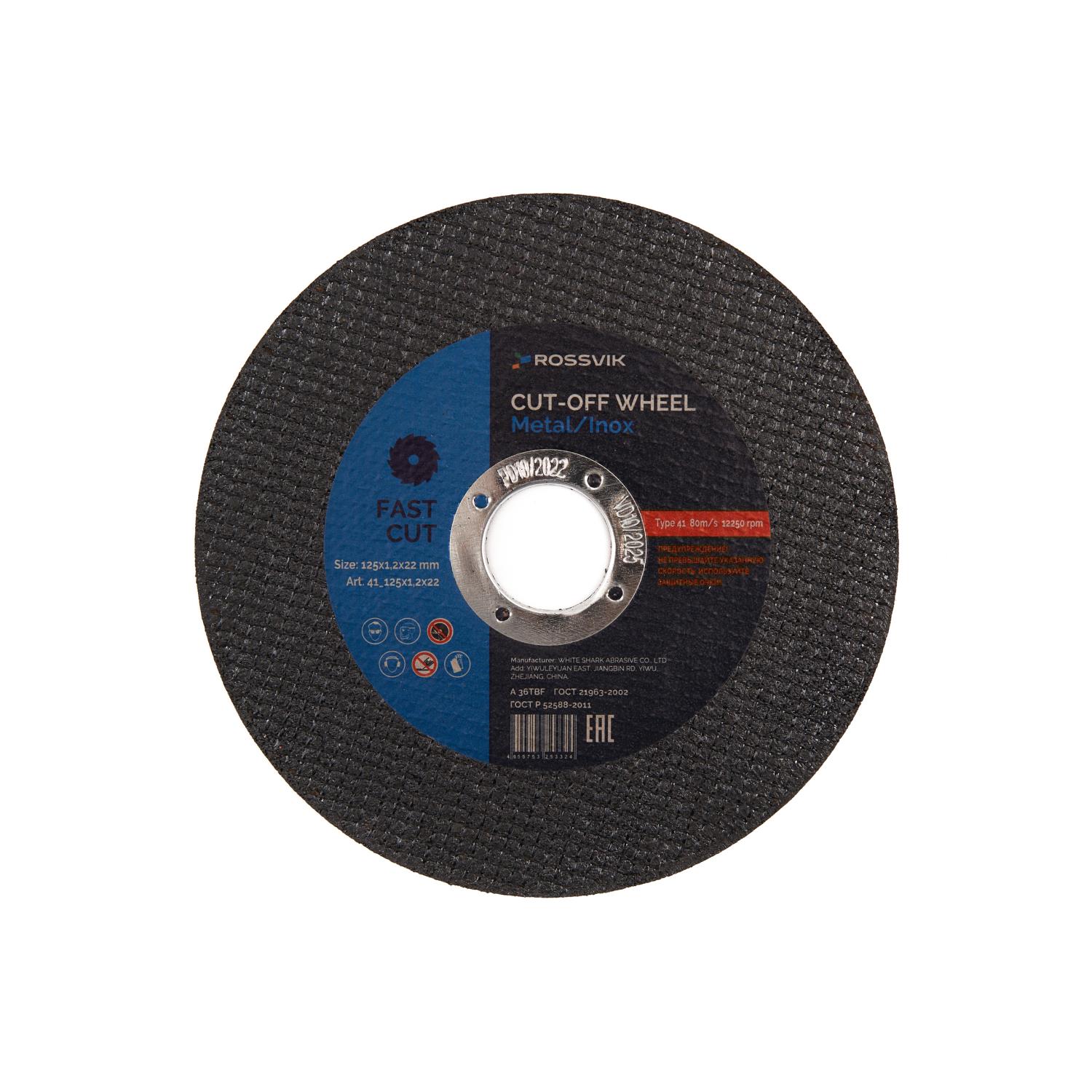 Круг отрезной по металлу ROSSVIK 125*1,2*22мм. Тип 41, 80м/с, 12250об/мин