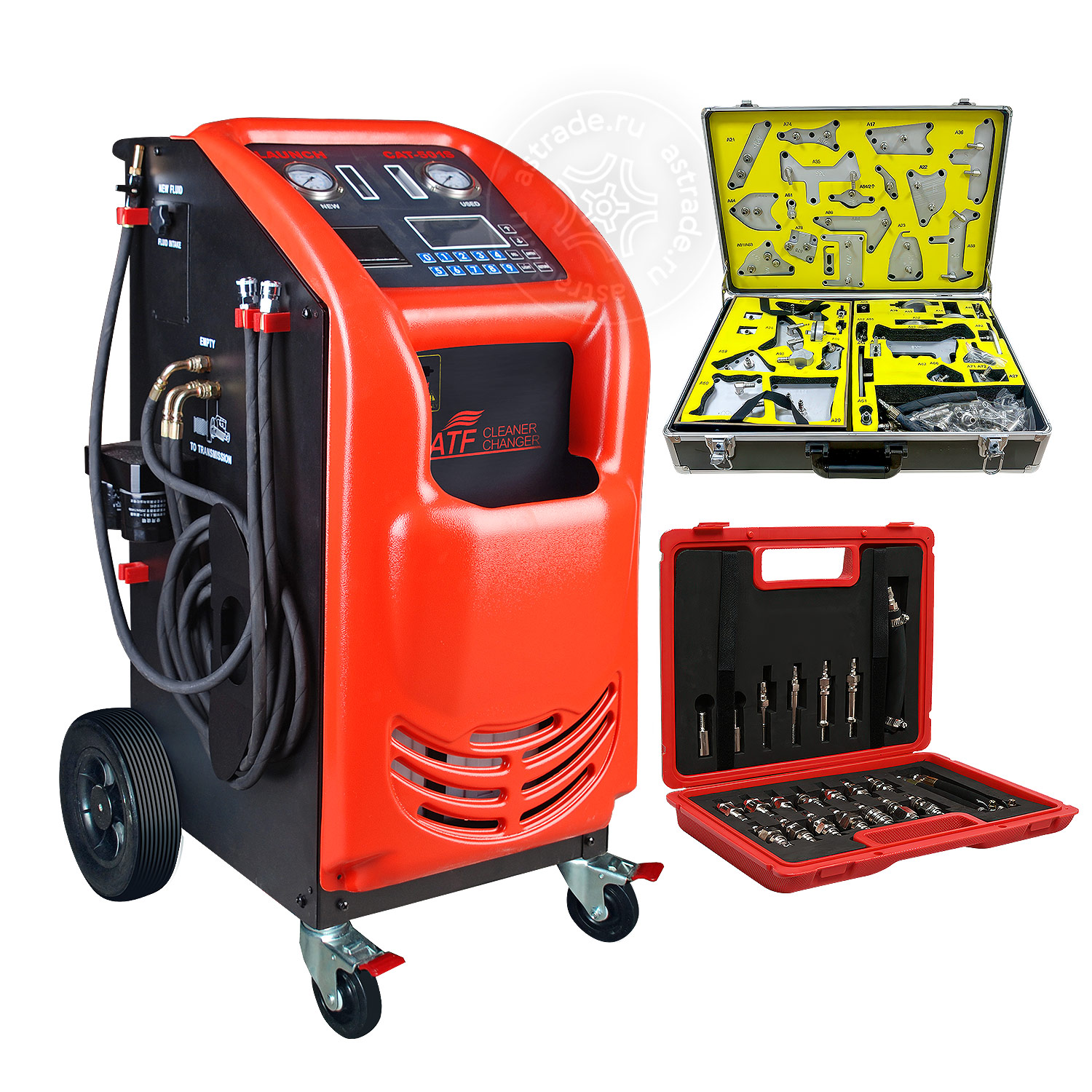 Launch CAT-501 S с дополнительными адаптерами - оборудование для замены масла в АКПП. Стенд работает методом вытеснения старого масла новым, точно контролируя замену по весу. Оснащен сменными фильтрами и встроенной базой данных.