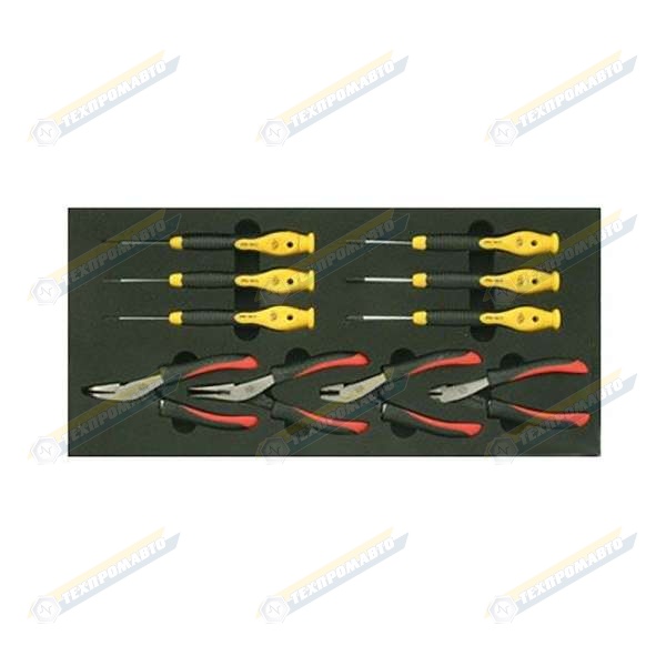 Ложемент губцевый инструмент для электрика BX012. Состав: отвертки крестовые Philips: PH 00х50 мм, PH 0х50 мм, PH 1х50 мм; отвертки шлицевые: 1,5х50 мм, 2х50 мм, 3х50 мм; бокорезы 115 мм; плоскогубцы универсальные 120мм; круглогубцы универсальные с удлиненными губками 135 мм; круглогубцы универсальные с удлиненными загнутыми губками 125 мм