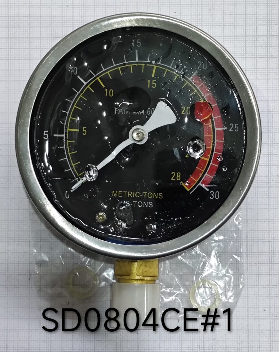 Манометр глицериновый. Обеспечивает высокую точность измерения и плавный ход стрелки без вибраций, за счет наполнения корпуса глицерином. Корпус изготовлен из нержавеющей стали, элементы измерительного механизма выполнены из меди. Особенности: Ударопрочный корпус. Увеличенный срок службы. Диапазоны измерений: Метрическая тонна / US Тонна. Размер резьбы: М20х1,5. Рабочее давление: 20т. Максимальное допустимое давление: 28т. Цена деления шкалы: 1т.Применяемость к прессам: SD0805 SD0805C SD0804 SD0804CE