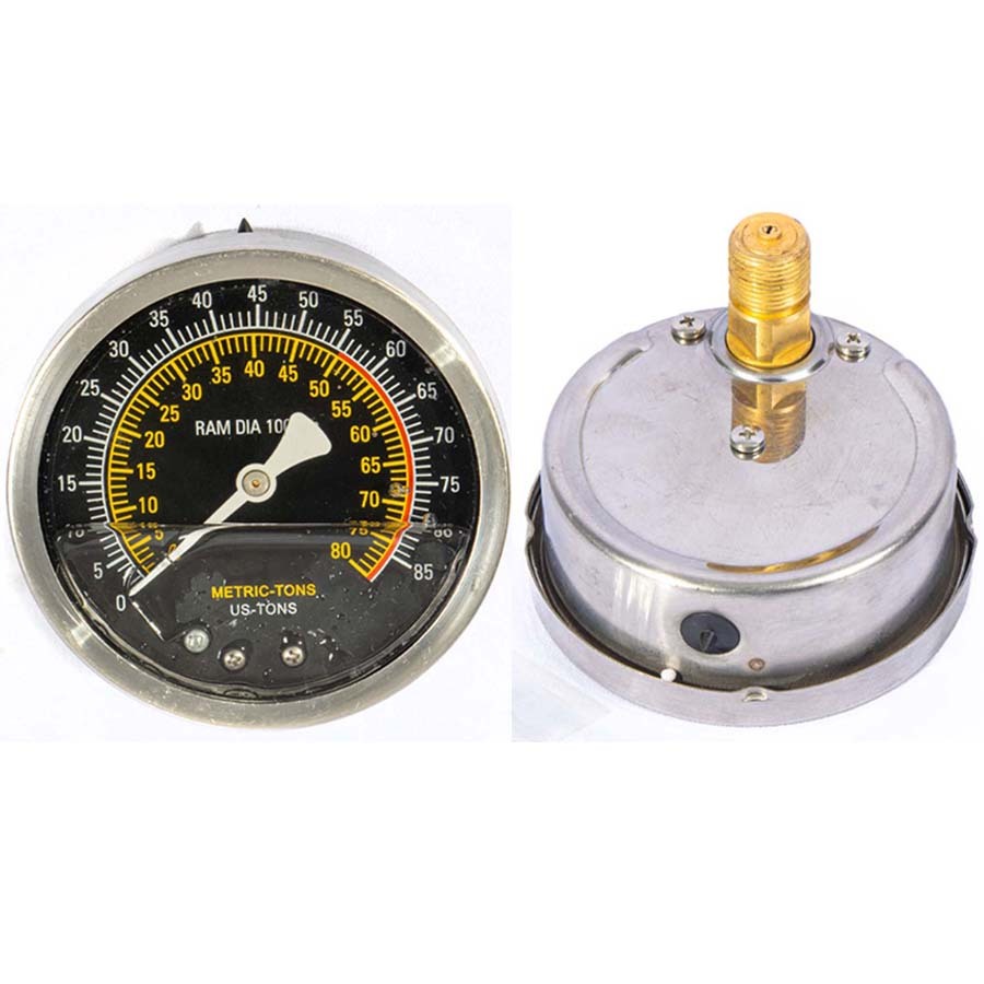 Манометр глицериновый. Обеспечивает высокую точность измерения и плавный ход стрелки без вибраций, за счет наполнения корпуса глицерином. Корпус изготовлен из нержавеющей стали, элементы измерительного механизма выполнены из меди. Особенности: Ударопрочный корпус. Увеличенный срок службы. Диапазоны измерений: Метрическая тонна / US Тонна. Размер резьбы: М20х1,5. Рабочее давление: 50т. Максимальное допустимое давление: 80т. Цена деления шкалы: 1т. Применяемость к прессам: SD0811СЕ