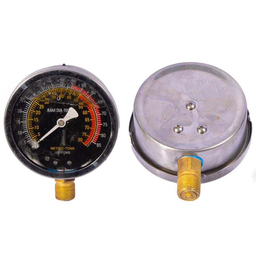 Манометр глицериновый. Обеспечивает высокую точность измерения и плавный ход стрелки без вибраций, за счет наполнения корпуса глицерином. Корпус изготовлен из нержавеющей стали, элементы измерительного механизма выполнены из меди. Особенности: Ударопрочный корпус. Увеличенный срок службы. Диапазоны измерений: Метрическая тонна / US Тонна. Размер резьбы: М20х1,5. Рабочее давление: 50т. Максимальное допустимое давление: 80т. Цена деления шкалы: 1т. Применяемость к прессам: SD0881