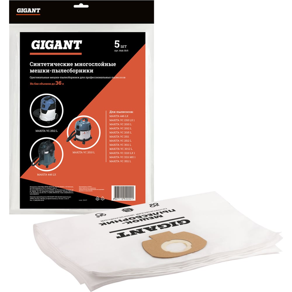 Мешки Gigant G-Mak-30/5 для пылесосов MAKITA изготовлены из синтетического материала, обладающего большей механической прочностью, по сравнению с бумажными пылесборниками. Не теряют фильтрующих качеств даже при работе с влажным мусором. При использовании данных пылесборников двигатель пылесоса работает без перегрузок. В комплекте 5 штук. Мешки используются в качестве расходного материла в профессиональных пылесосах: * MAKITA 446 LX, VC 1310 LX 1, VC 2010 L, VC 2012 L, VC 2015, VC 2511, VC 2512 L, VC 3011 L, VC 3210 LX 1, VC 3211 MX 1, VC 3511 L. Gigant – собственная торговая марка компании ВсеИнструменты.ру, разработанная специально для требовательных мастеров. Продукция представлена профессиональными и бытовыми инструментами, имеет доступную цену и высокое качество. При изготовлении товаров Gigant используется современное оборудование и прочные материалы. Производство осуществляется на современных предприятиях России и Азии. Тестирование товаров осуществляется в два этапа, каждая партия инструментов проходит проверку на соответствие стандартам и заявленным техническим характеристикам. Это является залогом качества и надежности готового продукта. Продукция представлена широкой линейкой инструментов. У нас можно приобрести ручной инструмент, строительный, садовый, сантехнический, климатический, крепежный, автогаражный, а также станки, расходные материалы и многое другое.