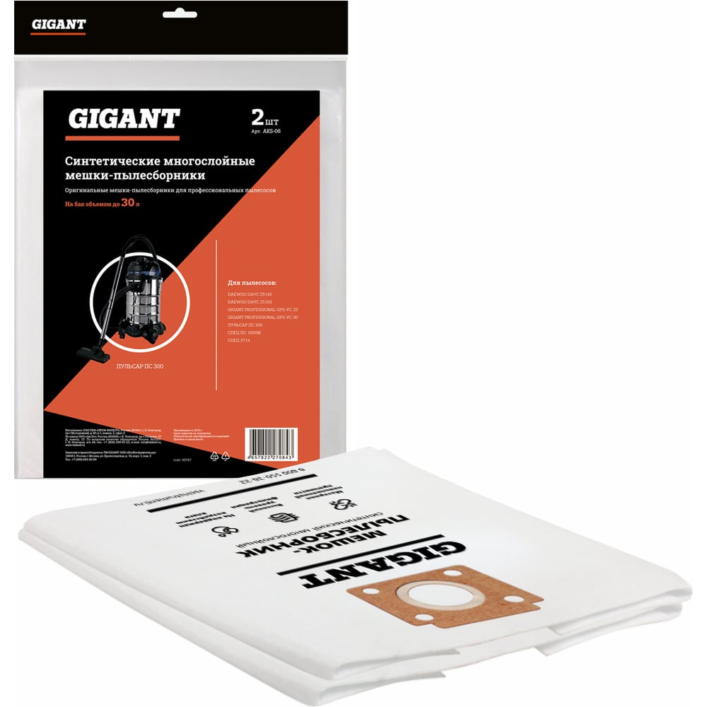 Мешок для пылесоса синтетический до 20 литров, 2 шт Gigant AKS-06 имеет высокий уровень фильтрации. Подходит для влажной и сухой уборки. Мешки многослойные, пропускают воду, устойчивы к острым предметам, сохраняют мощность всасывания, имеют увеличенный срок службы.