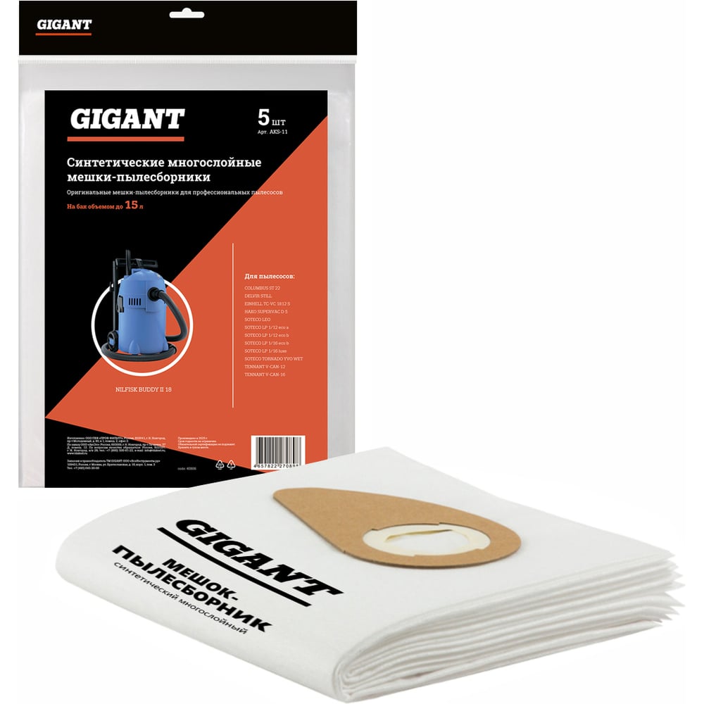 Мешок для пылесосов синтетический до 15л, 5шт Gigant AKS-11 предназначен для промышленных пылесосов, используется в качестве пылесборника. Изготовлен из синтетического материала.