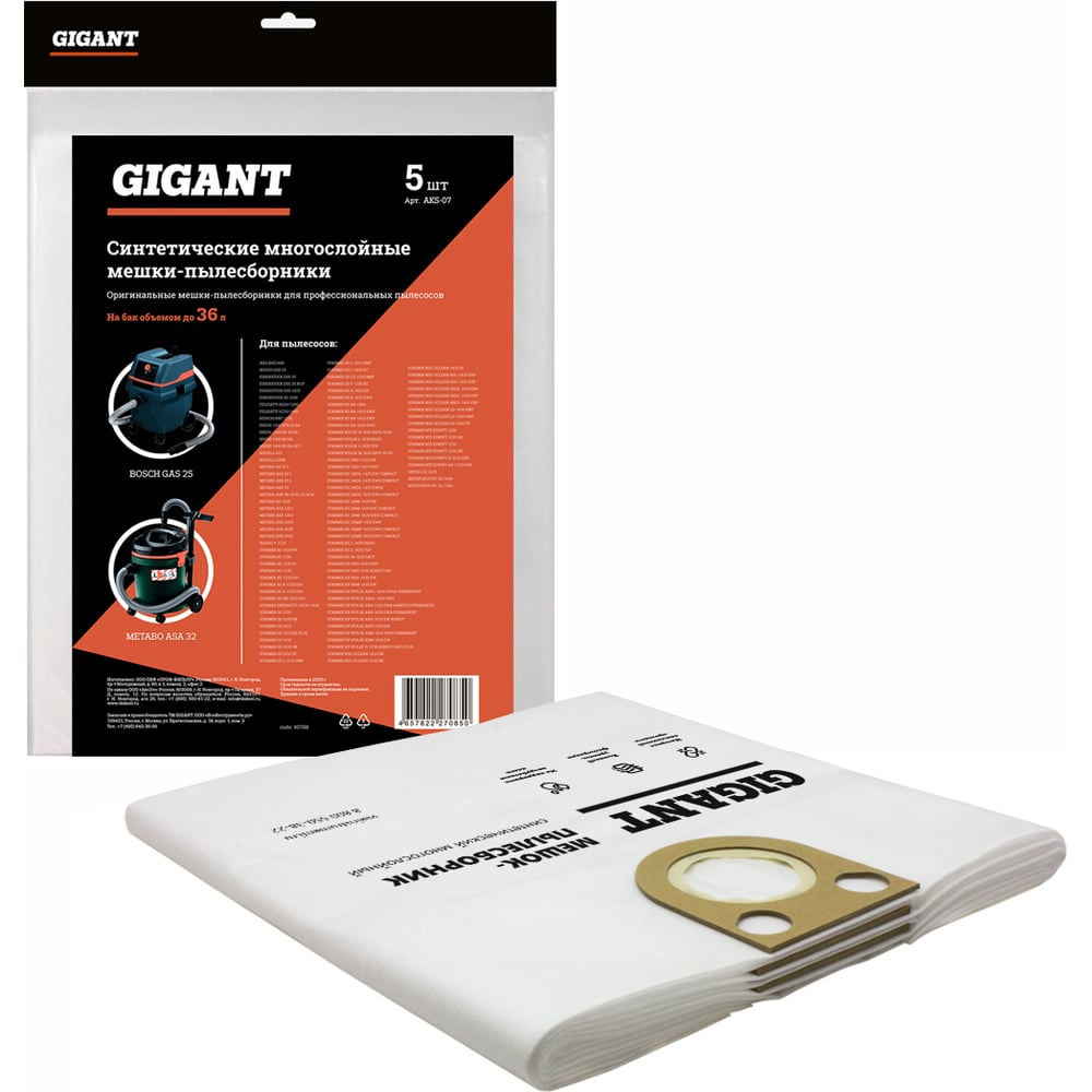 Мешок-пылесборник синтетический трехслойный до 35л, 5шт Gigant AKS-07 произведен из трехслойного нетканого синтетического волокна MicroFib. Применяется для тонкой очистки воздуха от мельчайшей пыли. Пылесборник надежен в использовании благодаря своей высокой прочности и устойчивости к попаданию влаги и острых предметов.