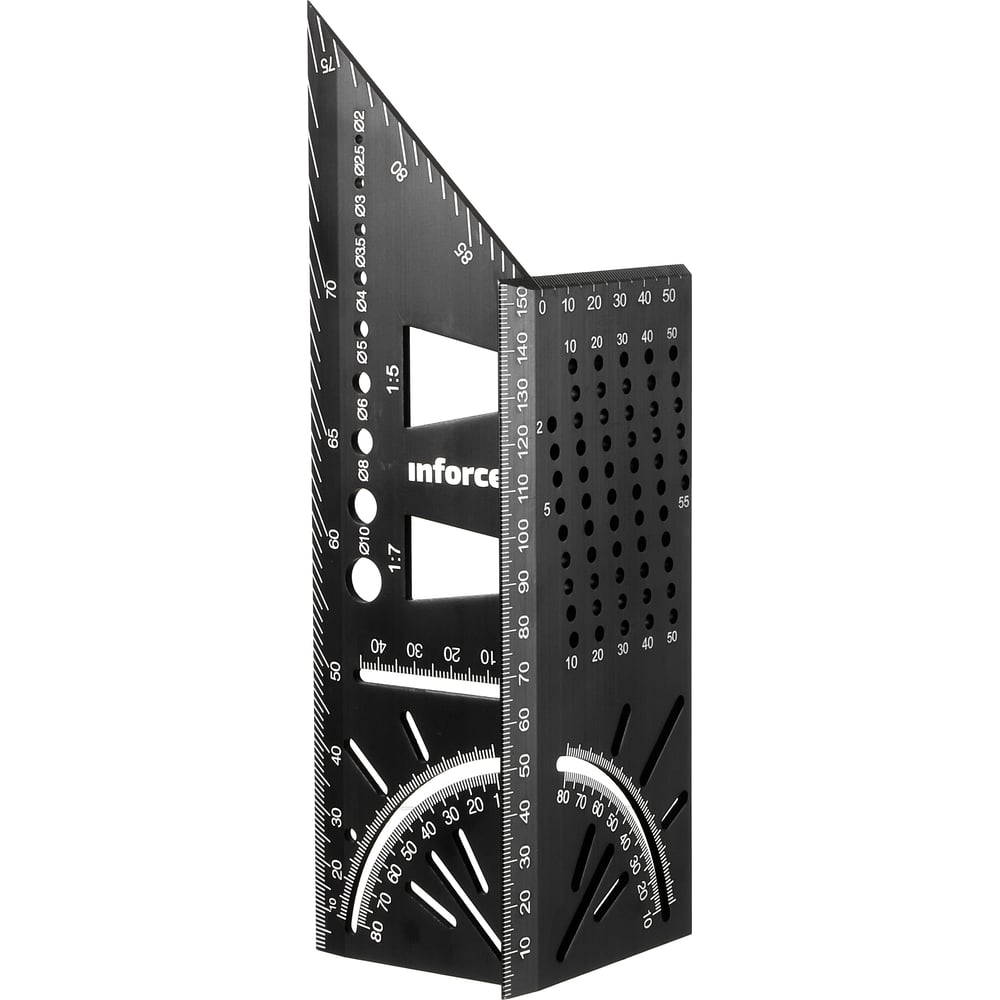 Многофункциональный разметочный угольник Inforce 150 мм 06-11-81 позволяет работать с 3D материалами, такими как деревянные балки, трубы. Имеет ограничители угла 45 ° и 90 °. С помощью угольника возможно определения размера сверла, переноски измерения, рисование параллельных линий. Разметка хорошо заметна даже при слабом освещении.