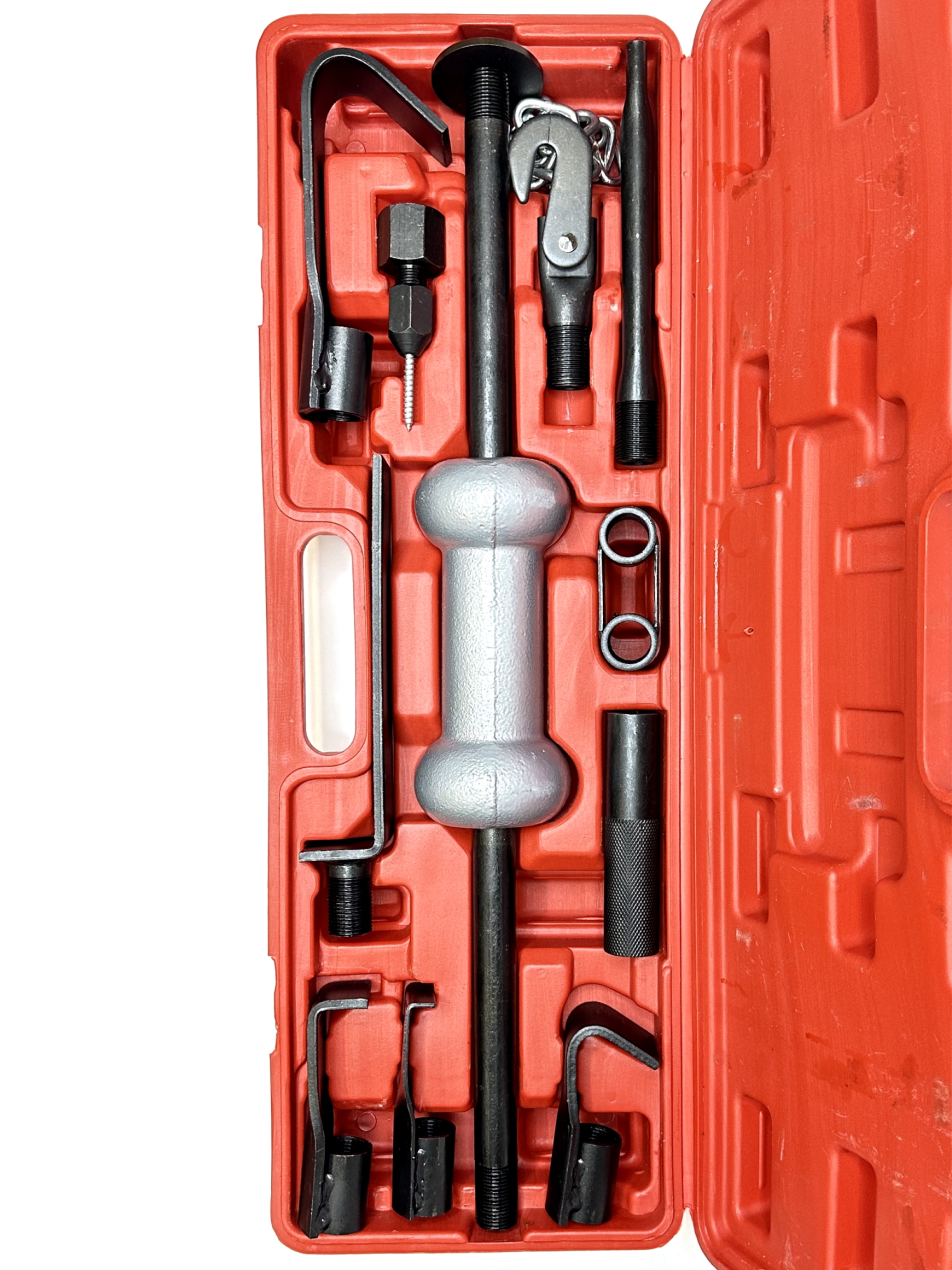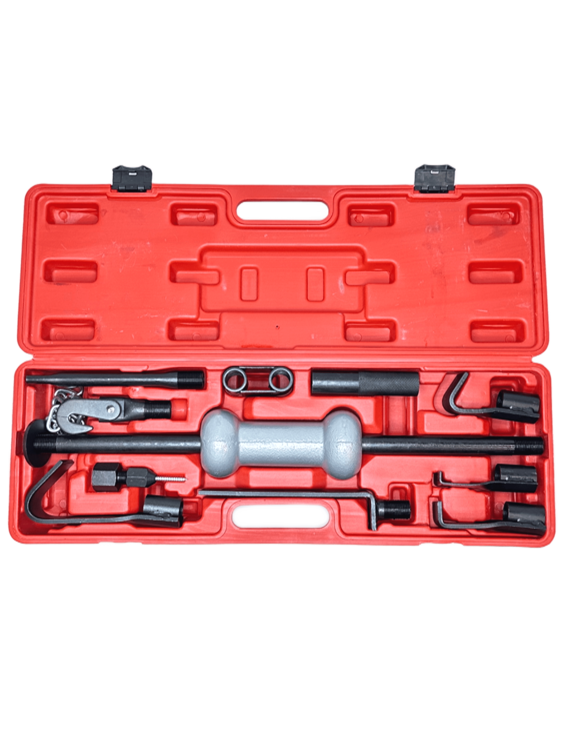 Набор предназначен для восстановления геометрии кузовных деталей автомобиля. Используется для удаления вмятин. Незаменим для работы с деталями, доступ к которым открыт только снаружи (пороги, стойки, арки и т.д.) Принцип работы: Необходимый захват крепится к деформированной детали, а скользящий молот (боёк) ударяется в опорную шайбу. Комплект набора: Основная направляющая труба (общая длина 590 мм) - 1 шт. Молот скользящий (боёк) чугунный - 1 шт. Захват угловой 50° (общая длина 105 мм, ширина 38 мм, крюк 35 мм) - 1 шт. Захват угловой 30° (общая длина 165 мм, ширина 38 мм, крюк 55 мм) - 1 шт. Захват угловой 90° (общая длина 110 мм, ширина 38 мм, крюк 10 мм) - 1 шт. Захват угловой 90° (общая длина 110 мм, ширина 38 мм, крюк 25 мм) - 1 шт. Упор прямой со смещением 20 мм (общая длина 240 мм, ширина 38 мм) - 1 шт. Упор прямой плоский (общая длина 195 мм, ширина 32 мм) - 1 шт. Захват вкручивающийся резьбовой (общая длина 105 мм) - 1 шт. Насадка крюк с цепью (общая длина 500 мм) - 1 шт. Коннектор двойной резьбовой (80 х 40 мм) - 1 шт. Шайба упорная (55 мм) - 1 шт. Ручка рифлёная (общая длина 120 мм) - 1 шт. Кейс для хранения - 1 шт. Инструкция - 1 шт. При работе обязательно используйте защитные очки! Использование набора допускается только квалифицированным персоналом с соблюдением техники безопасности!