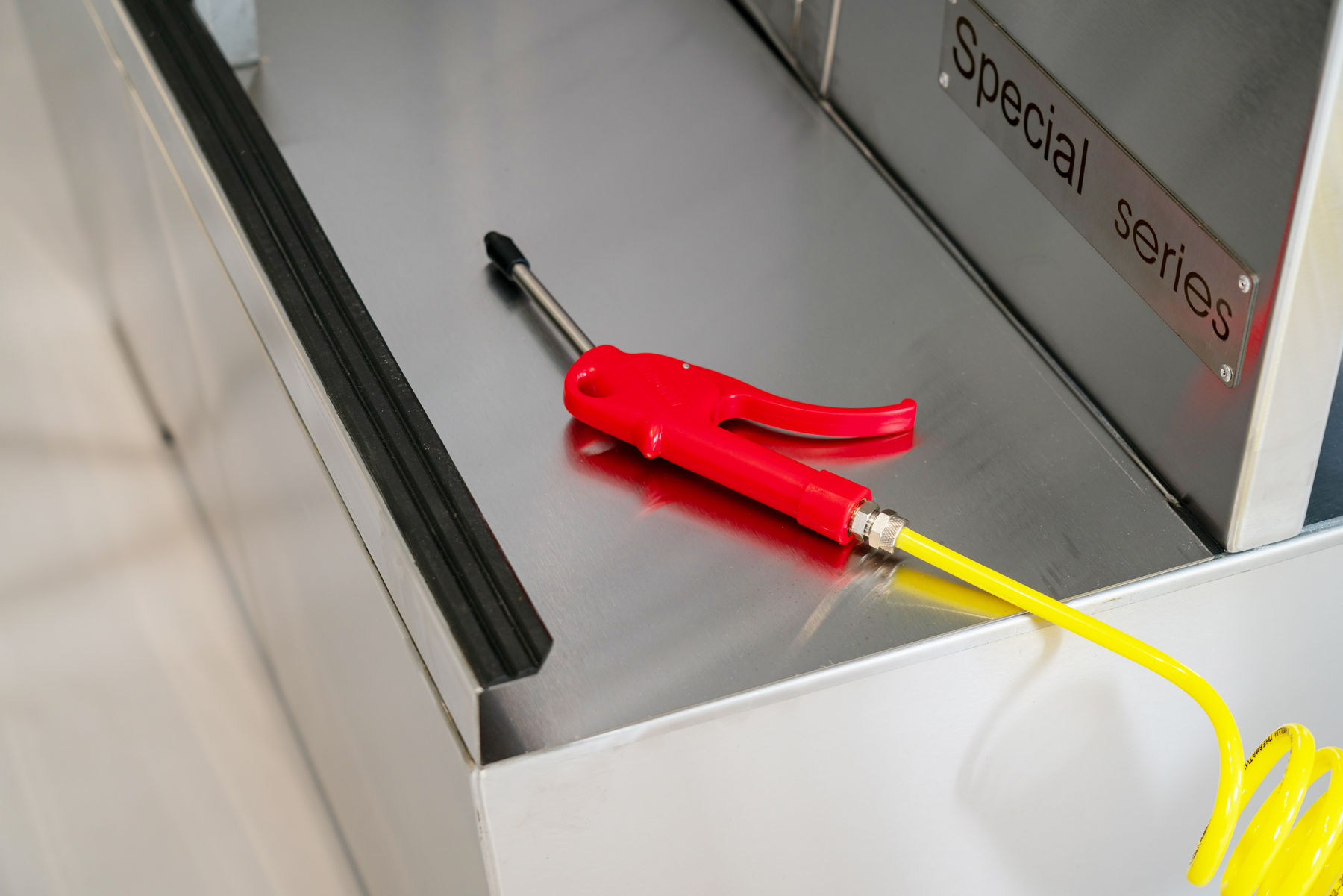 - Встроенный пистолет эффективного обдува: Мощная воздушная струя удаляет остатки воды и гранул, обеспечивая чистоту и комфорт при дальнейшей работе с колесом