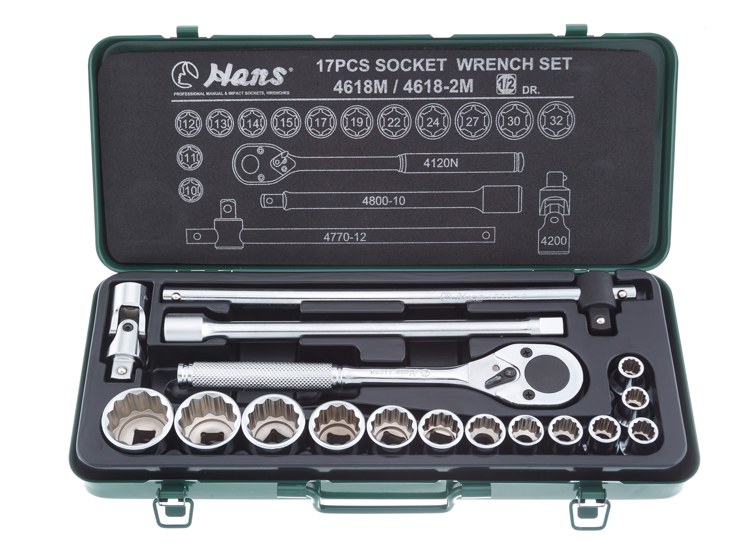 Набор инструментов 1/2" 10-32 мм (18 предметов) Головки торцевые двенадцатигранные, привод 1/2" (10; 11; 12; 13; 14; 15; 17; 19; 22; 24; 27; 30; 32 мм) - 13 шт Удлинители, привод 1/2", длина 250 мм - 1 шт Ключ трещоточный реверсивный, привод 1/2", длина 250 мм - 1 шт Шарнир карданный, привод 1/2" - 1 шт Рукоятка скользящая Т-образная, привод 1/2", длина 300 мм - 1 шт
