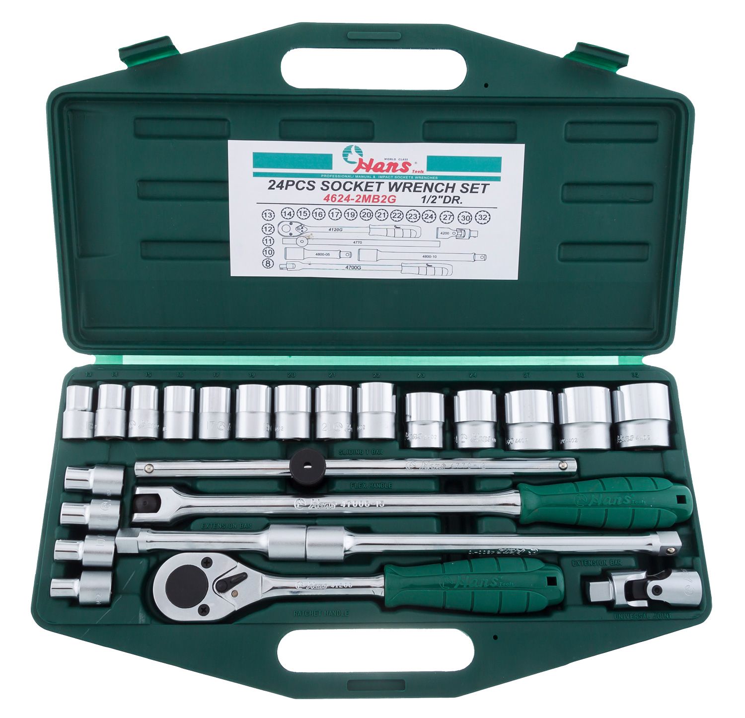 Набор инструментов 1/2" 8-32 мм (24 предмета) Головки двенадцатигранные торцевые (8, 10, 11, 12, 13, 14, 15, 16, 17, 19, 20, 21, 22, 23, 24, 27, 30, 32 мм) – 18 шт Ключ трещоточный, длина 250 мм – 1 шт Шарнир карданный, длина 70 мм – 1 шт Вороток шарнирный, длина 380 мм – 1 шт Т-образный вороток, длина 300 мм – 1 шт Удлинитель, длина 125 мм – 1 шт Удлинитель, длина 250 мм – 1 шт