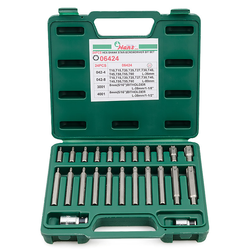 06424 комплект бит 24 штуки в кейсе - битодержатель 8 мм (5/16') L=28мм/1-1/8' - битодержатель 8 мм (5/16') L=38мм/1-1/2' Биты: T10,T15,T20,T25,T27,T30,T40,T45,T50,T55,T60 L=36 мм Биты длинные: T10,T15,T20,T25,T27,T30,T40,T45,T50,T55,T60 L=80 мм