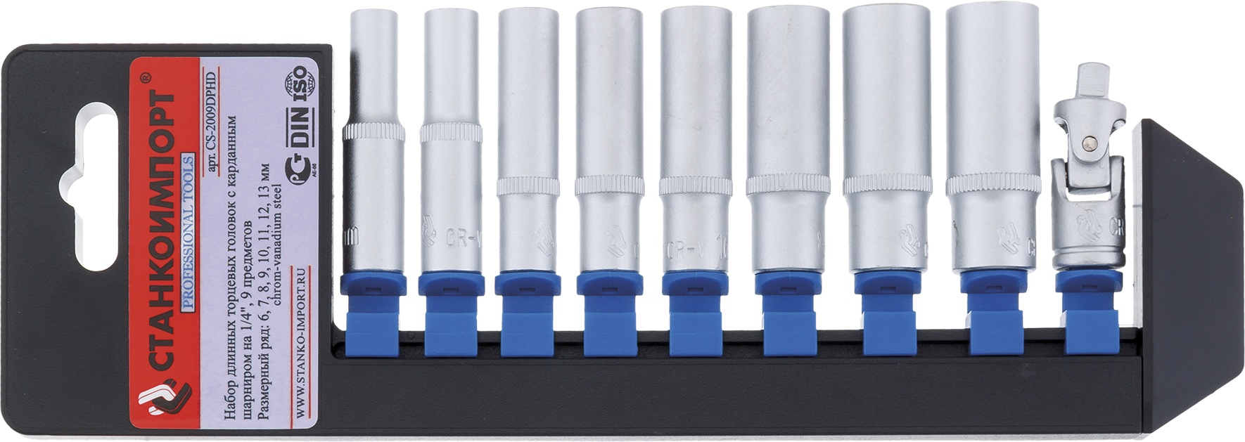 Набор торцевых головок 1/4" высокие 9 предметов (пластиковая стойка) 8 — головки торцевые высокие: 6, 7, 8, 9, 10, 11, 12, 13мм 1 — 1/4" кардан шарнирный