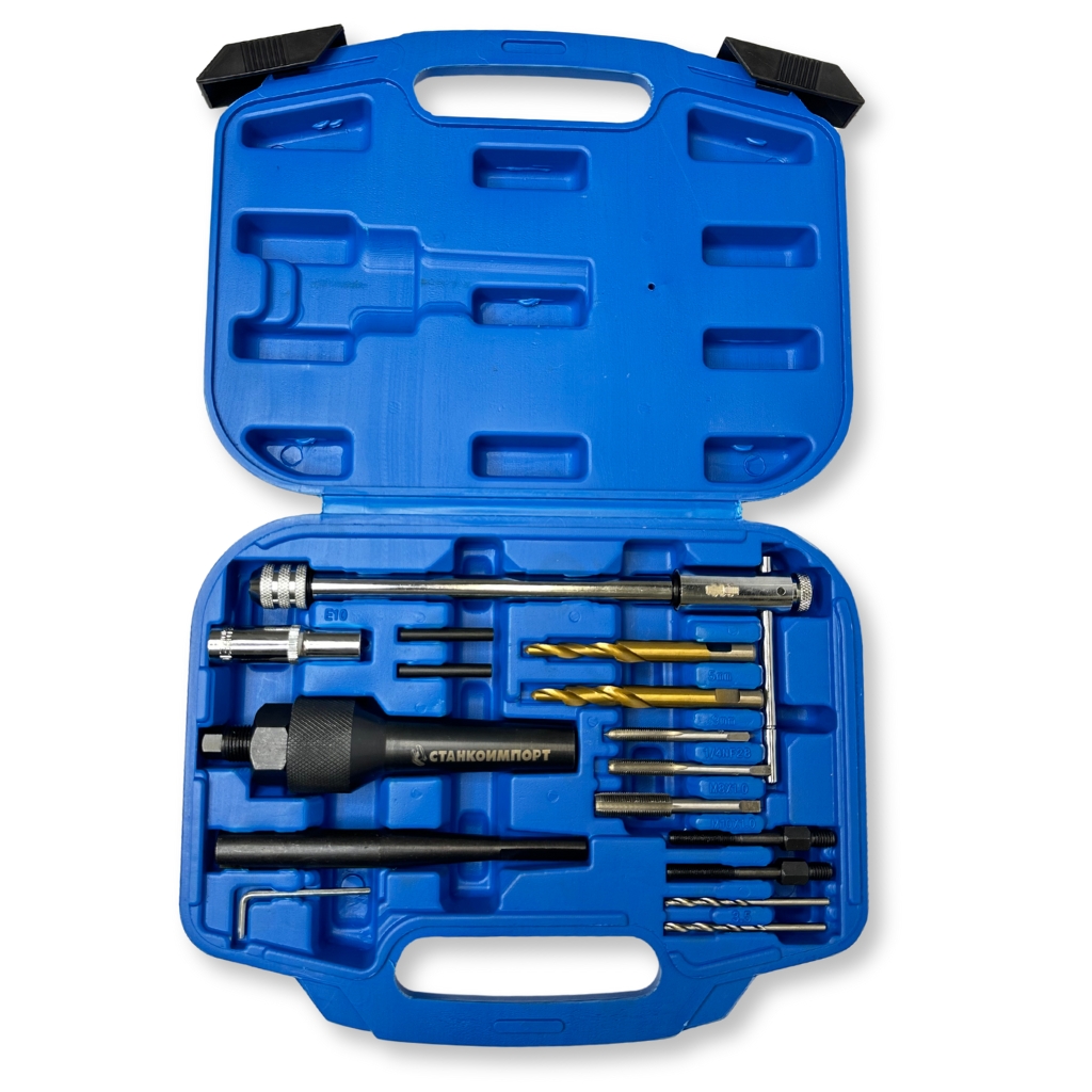 Набор приспособлений предназначен для извлечения сломанных свечей накаливания механическим путём без демонтажа головки блока цилиндров. Комплектация: 1. Метчики: 3шт 2. Держатель для сверла — 1 шт.; 3. Сверла: Ø3.5 — 2 шт.; 4. Торцевой ключ для откручивания свечи — 1 шт.; 5. Ступенчатые свёрла — 2 шт.; 6. Т-образный вороток — 1 шт.; 7. Вытяжное устройство для извлечения свечи — 1 шт.; 8. Ключ шестигранный — 1 шт.; 9. Шпилька для чистовой прогонки резьбы — 2 шт.; 10. Центровки для сверла — 2 шт.