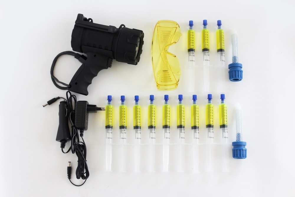 В систему вводят специальный флуоресцентный краситель и он циркулирует вместе с хладагентом, и если есть утечка — краситель выходит наружу. Под воздействием ультрафиолетового излучения беспроводной лампы этот краситель начинает ярко светиться голубовато-зеленым цветом, чётко обозначая место утечки. Детектор с УФ фонарем и очками позволяет обнаруживать утечки в любых частях системы: на шлангах, трубках, радиаторах, испарителе, компрессоре и других элементах.
