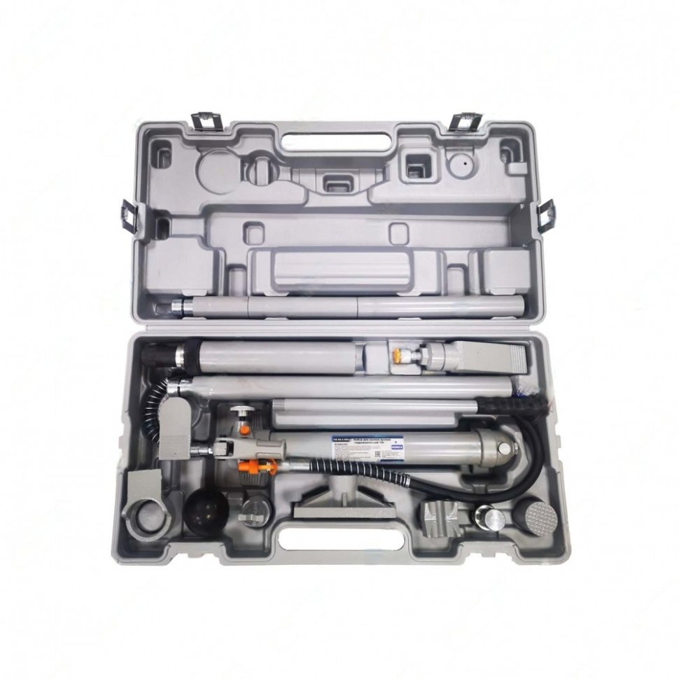 Комплект поставки: Пластиковый кейс на колесах. Гидравлический насос со шлангом растяжка 10 т. распределительный клин рифленая головка для растяжки 4 удлинителей соединитель насадок круглая прорезиненная головка клиновидная головка V-образная головка насадка на поршень насадка на цилиндр. Всего 15 единиц оборудования в кейсе 1030×500×215 мм.