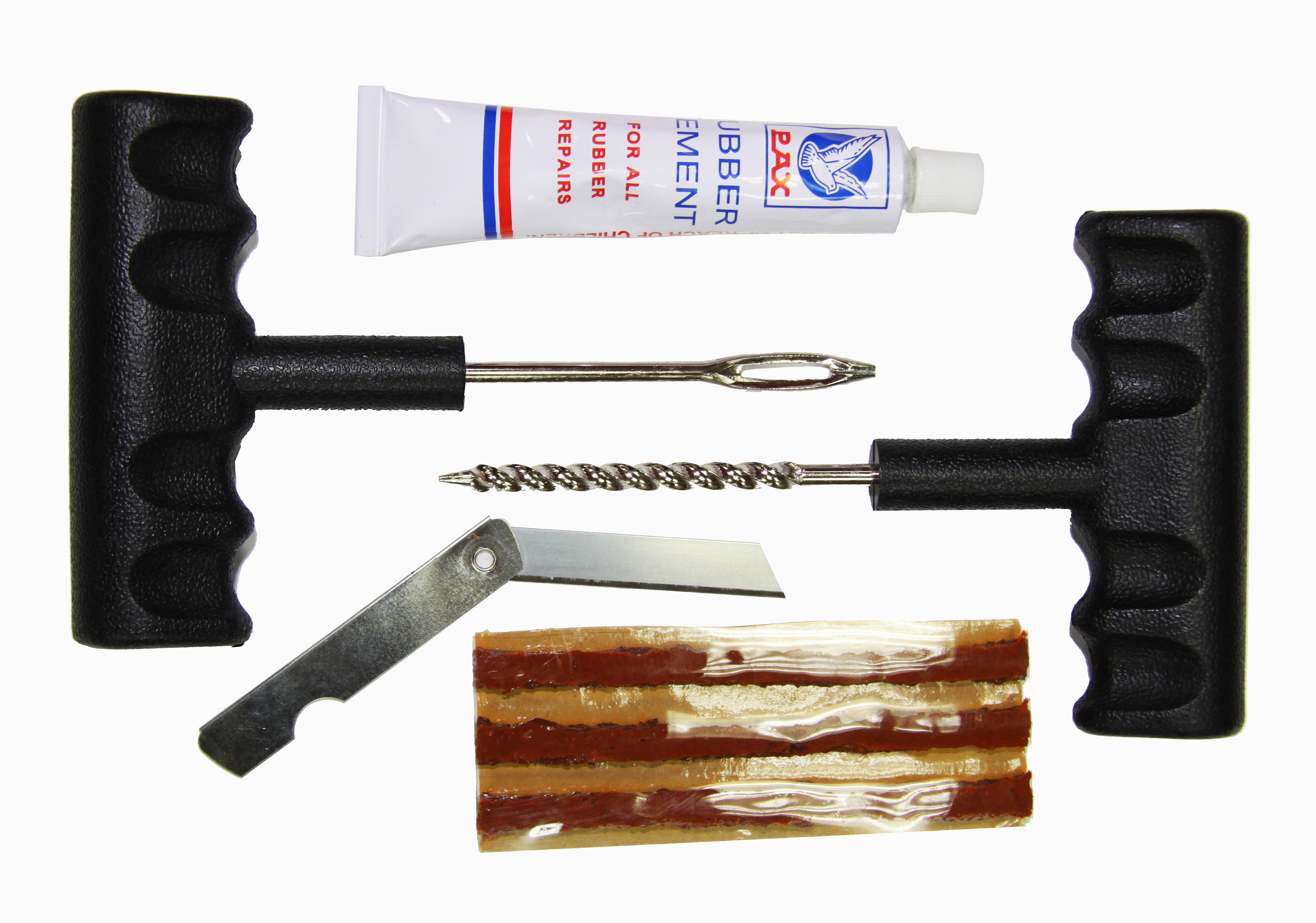 KA-9004-5 Набор для ремонта шин. Предназначен для ремонта небольших проколов бескамерных шин. Принцип работы: Жгут (полоска сырой резины) помещается в отверстье прокола специальным шилом с ушком. Излишки резины отрезаются ножом. (Более подробная технология ремонта описана в инструкции). Особенности: Идеально подходит для использования как автолюбителем, так и сотрудником шиномонтажной мастерской. Позволяет быстро отремонтировать прокол бескамерной шины. Для ремонта необходим лишь данный набор, домкрат и насос. Возможность ремонта шины без снятия колеса. Комплект набора: Шило спиральное для обрабатывания отверстья прокола - 1 шт. Шило с ушком для установки жгута - 1 шт. Жгуты ремонтные (полоски сырой резины) - 3 шт. Клей-активатор (тюбик) - 1 шт. Нож - 1 шт. Блистерная упаковка - 1 шт. Инструкция - 1 шт. При самостоятельном ремонте обязательно прочитайте инструкцию и чётко придерживайтесь указанным в ней рекомендациям! Учтите, что данный набор предназначен для устранения мелких проколов. Зачастую такой ремонт является временной мерой и позволяет добраться до шиномонтажной мастерской.