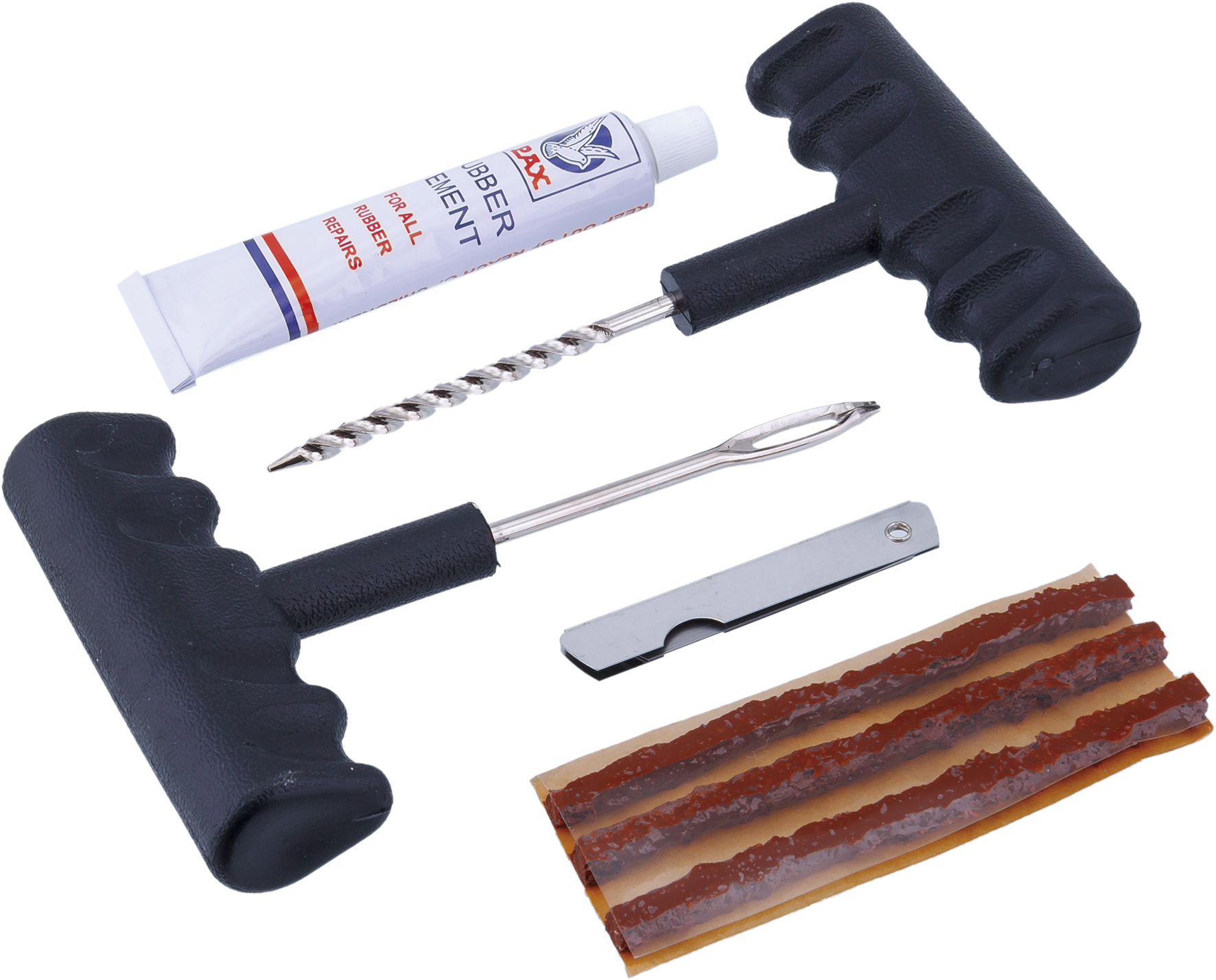 KA-9004-5 Набор для ремонта шин. Предназначен для ремонта небольших проколов бескамерных шин. Принцип работы: Жгут (полоска сырой резины) помещается в отверстье прокола специальным шилом с ушком. Излишки резины отрезаются ножом. (Более подробная технология ремонта описана в инструкции). Особенности: Идеально подходит для использования как автолюбителем, так и сотрудником шиномонтажной мастерской. Позволяет быстро отремонтировать прокол бескамерной шины. Для ремонта необходим лишь данный набор, домкрат и насос. Возможность ремонта шины без снятия колеса. Комплект набора: Шило спиральное для обрабатывания отверстья прокола - 1 шт. Шило с ушком для установки жгута - 1 шт. Жгуты ремонтные (полоски сырой резины) - 3 шт. Клей-активатор (тюбик) - 1 шт. Нож - 1 шт. Блистерная упаковка - 1 шт. Инструкция - 1 шт. При самостоятельном ремонте обязательно прочитайте инструкцию и чётко придерживайтесь указанным в ней рекомендациям! Учтите, что данный набор предназначен для устранения мелких проколов. Зачастую такой ремонт является временной мерой и позволяет добраться до шиномонтажной мастерской.