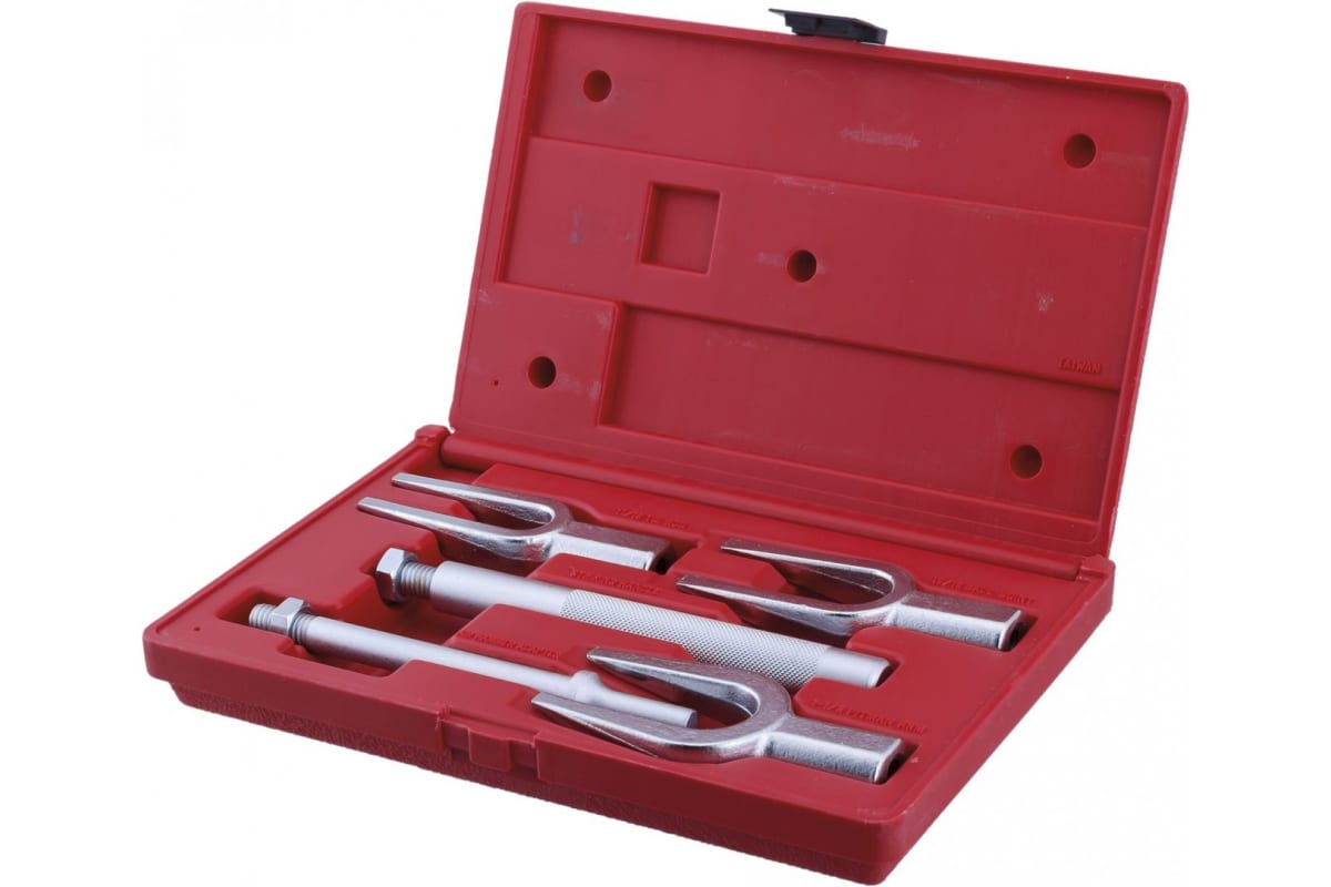 Набор KT TOOLS KA-6551 служит для демонтажа шаровых шарниров, рулевых тяг и рулевых сошек. Необходимая рукоятка легко присоединяется к вилке съемника. Если на детали есть шплинт, то его необходимо снять. Далее отворачиваются болты. Зубцы инструмента вставляются между частями детали. Съемник можно вбивать обычными или пневматическим молотком. Для снятия необходимой детали требуется применение усилия на рукоятку.