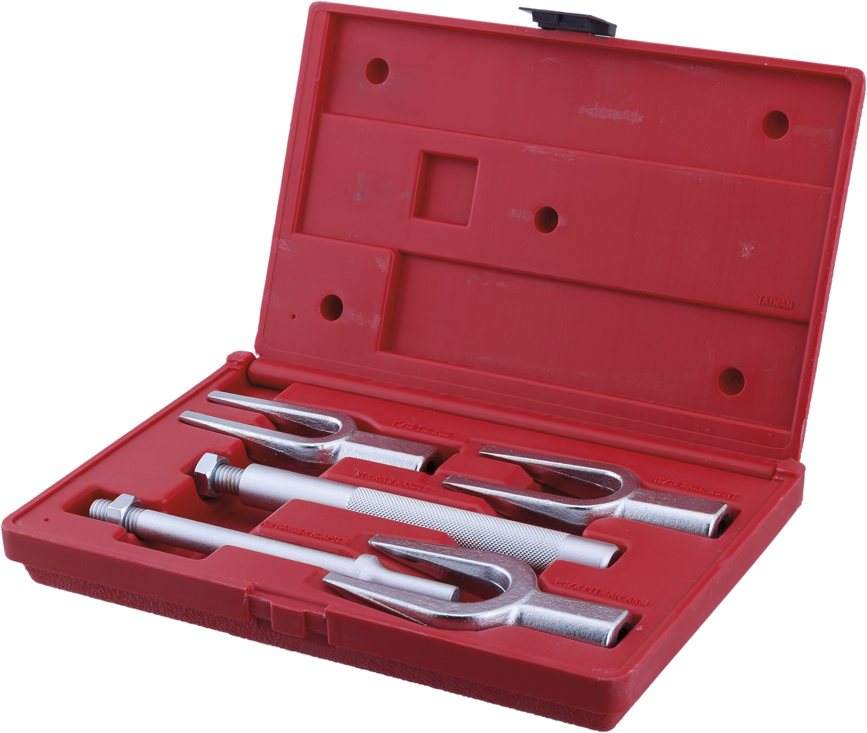 KA-6551 Набор для снятия шаровых шарниров, рулевых тяг и рулевых сошек 1-1/8" (28.5мм) 11/16" (17.4мм) 15/16" (23.8мм) Подсоедините необходимую рукоятку к вилке съемника. Если на детали есть шплинт, снимите его. Отверните крепежные болты с тяги, рулевой сошки или шарового шарнира. Вставьте зубцы съемника между частями детали. Вбейте съемник молотком или пневматическим молотком. Примените усилие на рукоятку для снятия детали