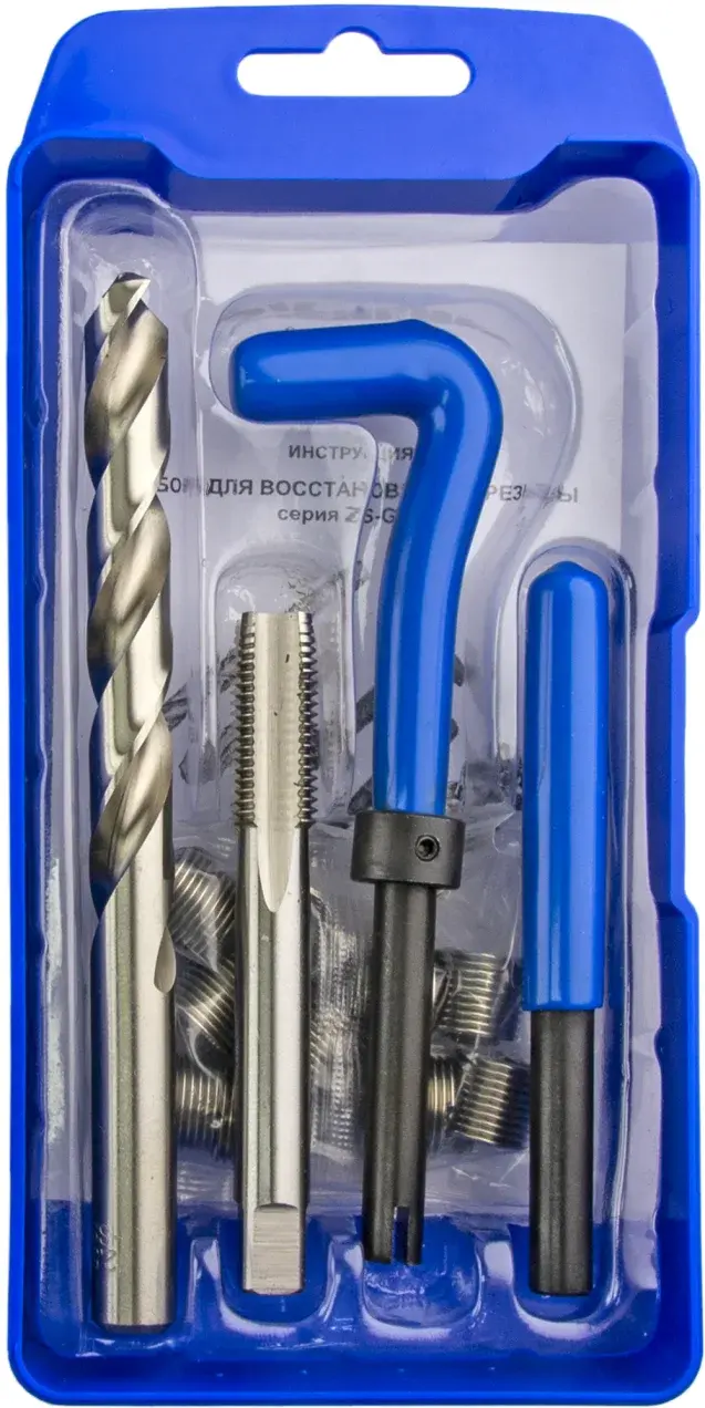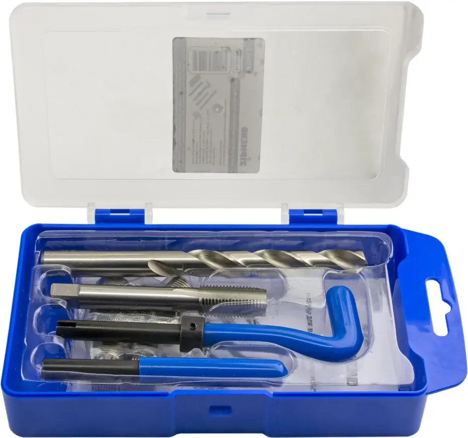 - Применение данного набора обеспечивает быстрое восстановление поврежденной резьбы при помощи специальных приспособлений.