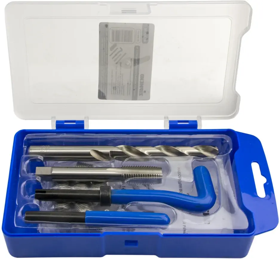 - Применение данного набора обеспечивает быстрое восстановление поврежденной резьбы при помощи специальных приспособлений.